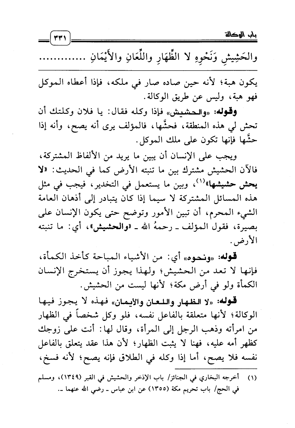 وقوله: «والحشيش» فإذا وكله فقال: يا فلان وكلتك أن تحش لي هذه المنطقة، فحشَّها، فالمؤلف يرى أنه يصح، وأنه إذا حشَّها فإنها تكون على ملك الموكل.