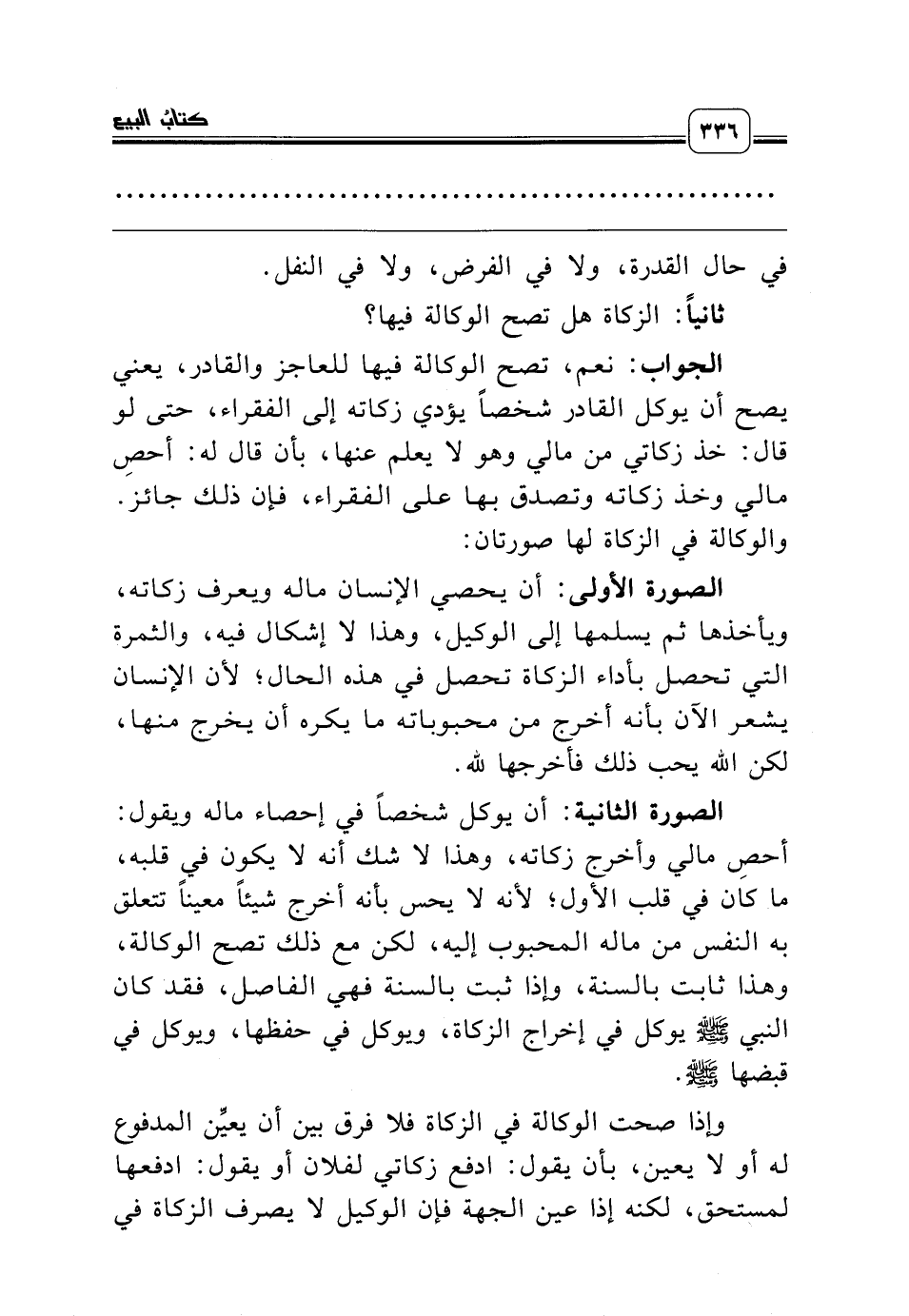 الصورة الثانية: أن يوكل شخصاً في إحصاء ماله ويقول: أحصِ مالي وأخرج زكاته، وهذا لا شك أنه لا يكون في قلبه، ما كان في قلب الأول؛ لأنه لا يحس بأنه أخرج شيئاً معيناً تتعلق به النفس من ماله المحبوب إليه، لكن مع ذلك تصح الوكالة، وهذا ثابت بالسنة، وإذا ثبت بالسنة فهي الفاصل، فقد كان النبي صلّى الله عليه وسلّم يوكل في إخراج الزكاة، ويوكل في حفظها، ويوكل في قبضها صلّى الله عليه وسلّم.