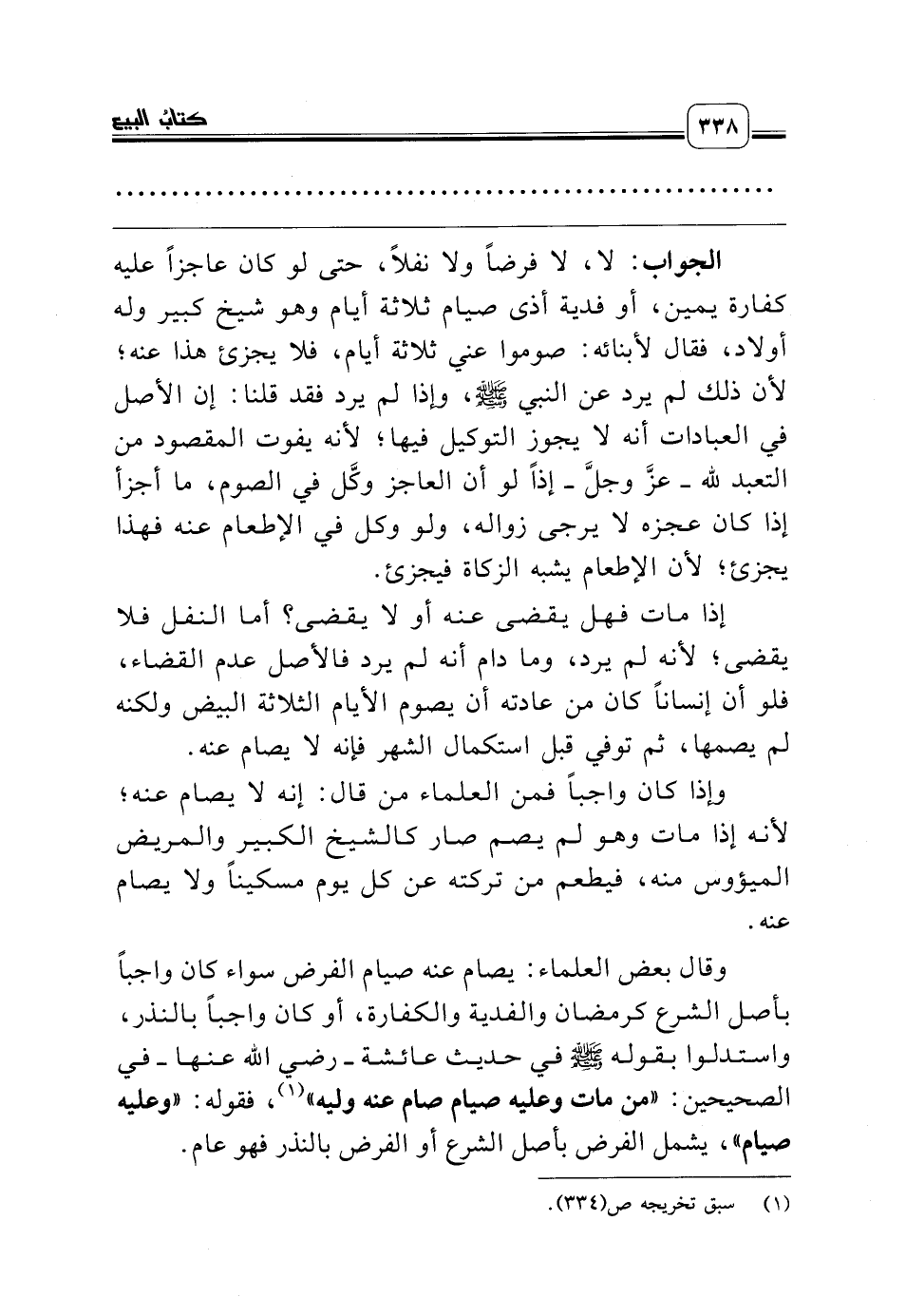 وقال بعض العلماء: يصام عنه صيام الفرض سواء كان واجباً بأصل الشرع كرمضان والفدية والكفارة، أو كان واجباً بالنذر، واستدلوا بقوله صلّى الله عليه وسلّم في حديث عائشة ـ رضي الله عنها ـ في الصحيحين: «من مات وعليه صيام صام عنه وليه» (¬1)، فقوله: «وعليه صيام»، يشمل الفرض بأصل الشرع أو الفرض بالنذر فهو عام.