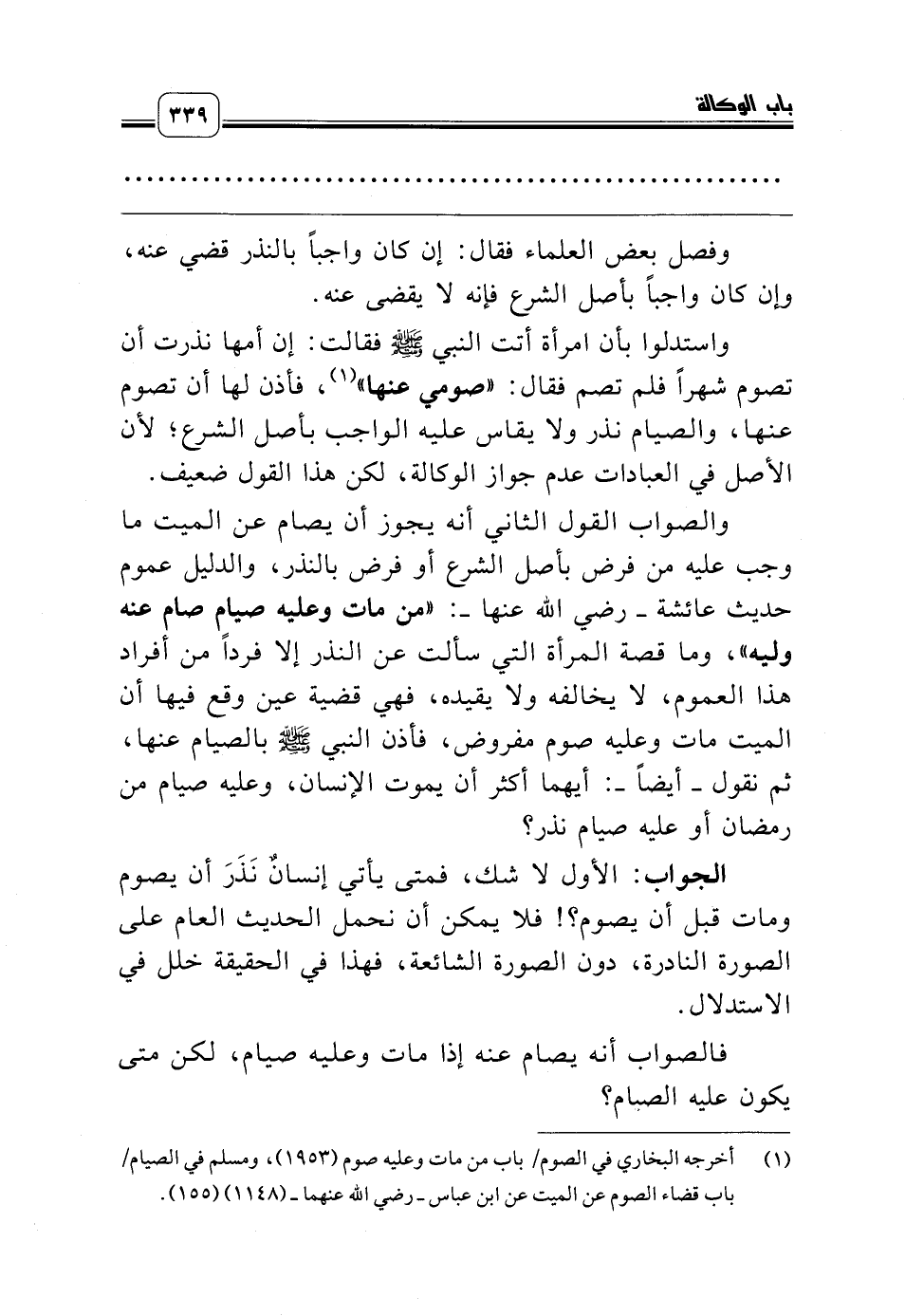 واستدلوا بأن امرأة أتت النبي صلّى الله عليه وسلّم فقالت: إن أمها نذرت أن تصوم شهراً فلم تصم فقال: «صومي عنها» (¬1)، فأذن لها أن تصوم عنها، والصيام نذر ولا يقاس عليه الواجب بأصل الشرع؛ لأن الأصل في العبادات عدم جواز الوكالة، لكن هذا القول ضعيف.