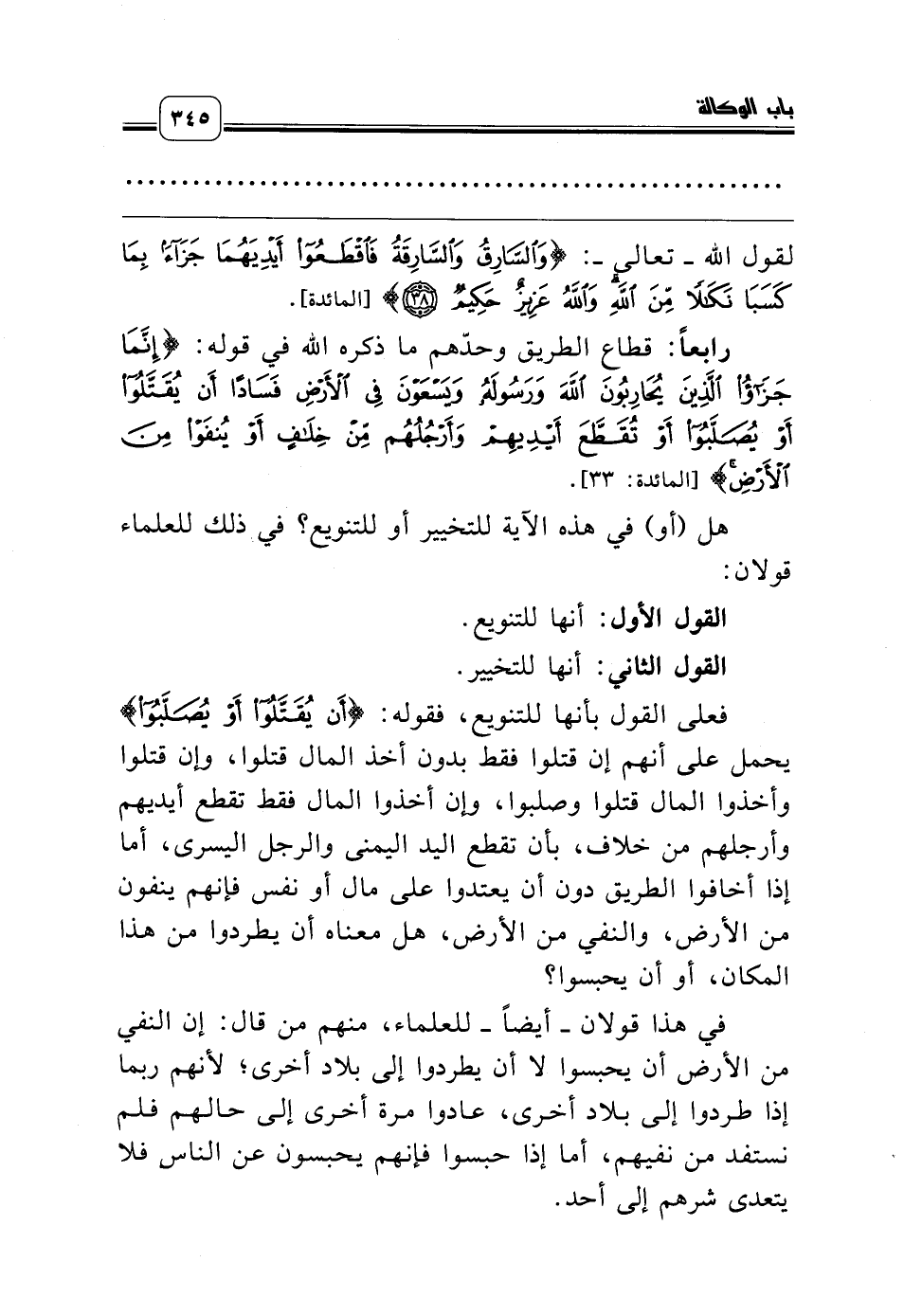 فعلى القول بأنها للتنويع، فقوله: {أَنْ يُقَتَّلُوا أَوْ يُصَلَّبُوا} يحمل على أنهم إن قتلوا فقط بدون أخذ المال قتلوا، وإن قتلوا وأخذوا المال قتلوا وصلبوا، وإن أخذوا المال فقط تقطع أيديهم وأرجلهم من خلاف، بأن تقطع اليد اليمنى والرجل اليسرى، أما إذا أخافوا الطريق دون أن يعتدوا على مال أو نفس فإنهم ينفون من الأرض، والنفي من الأرض، هل معناه أن يطردوا من هذا المكان، أو أن يحبسوا؟