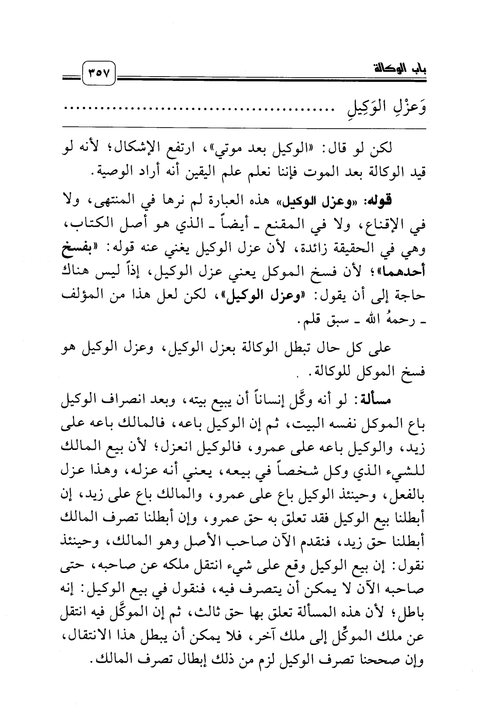 مسألة: لو أنه وكَّل إنساناً أن يبيع بيته، وبعد انصراف الوكيل باع الموكل نفسه البيت، ثم إن الوكيل باعه، فالمالك باعه على زيد، والوكيل باعه على عمرو، فالوكيل انعزل؛ لأن بيع المالك للشيء الذي وكل شخصاً في بيعه، يعني أنه عزله، وهذا عزل بالفعل، وحينئذ الوكيل باع على عمرو، والمالك باع على زيد، إن أبطلنا بيع الوكيل فقد تعلق به حق عمرو، وإن أبطلنا تصرف المالك أبطلنا حق زيد، فنقدم الآن صاحب الأصل وهو المالك، وحينئذ نقول: إن بيع الوكيل وقع على شيء انتقل ملكه عن صاحبه، حتى صاحبه الآن لا يمكن أن يتصرف فيه، فنقول في بيع الوكيل: إنه باطل؛ لأن هذه المسألة تعلق بها حق ثالث، ثم إن الموكَّل فيه انتقل عن ملك الموكِّل إلى ملك آخر، فلا يمكن أن يبطل هذا الانتقال، وإن صححنا تصرف الوكيل لزم من ذلك إبطال تصرف المالك.