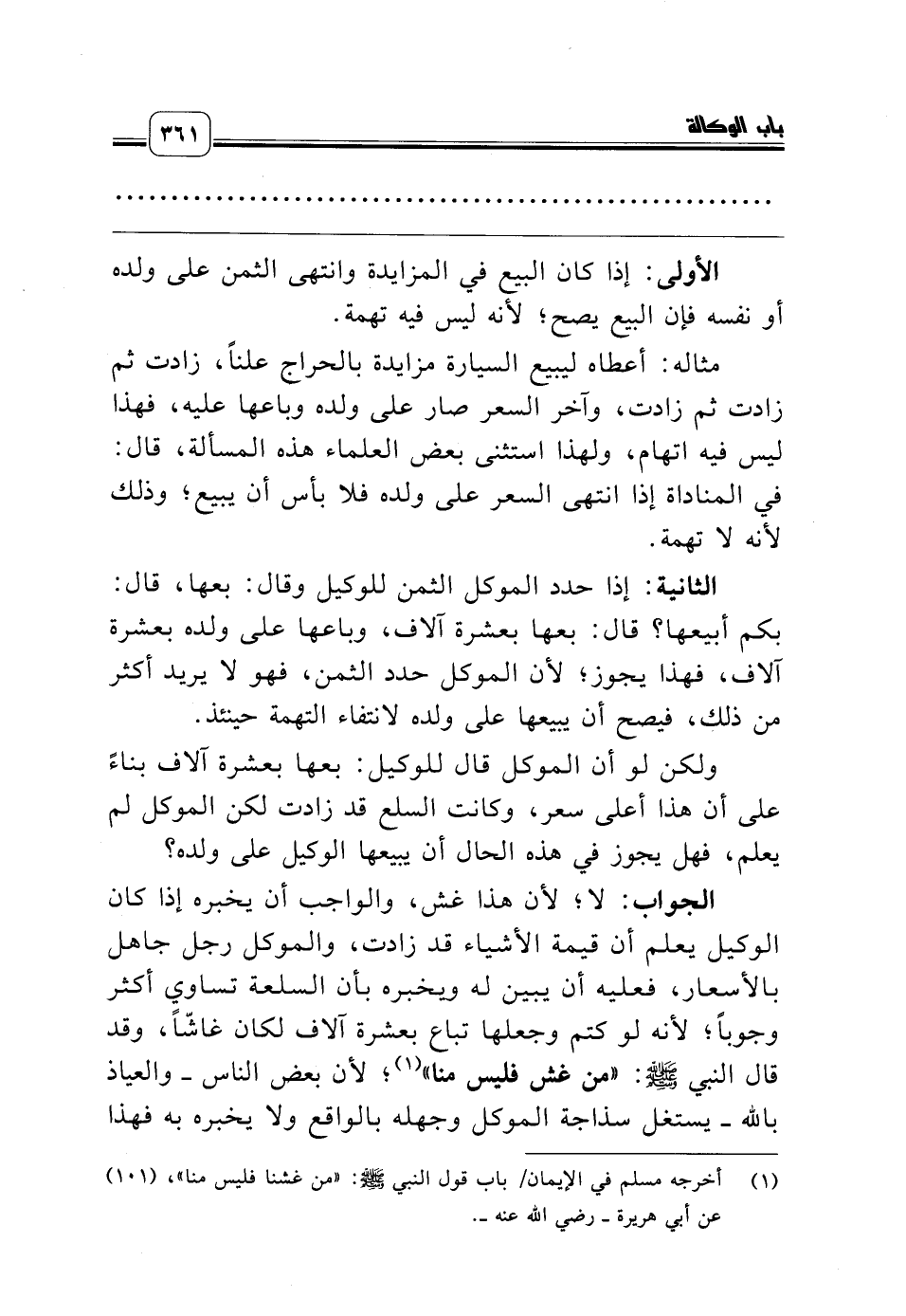 مثاله: أعطاه ليبيع السيارة مزايدة بالحراج علناً، زادت ثم زادت ثم زادت، وآخر السعر صار على ولده وباعها عليه، فهذا ليس فيه اتهام، ولهذا استثنى بعض العلماء هذه المسألة، قال: في المناداة إذا انتهى السعر على ولده فلا بأس أن يبيع؛ وذلك لأنه لا تهمة.