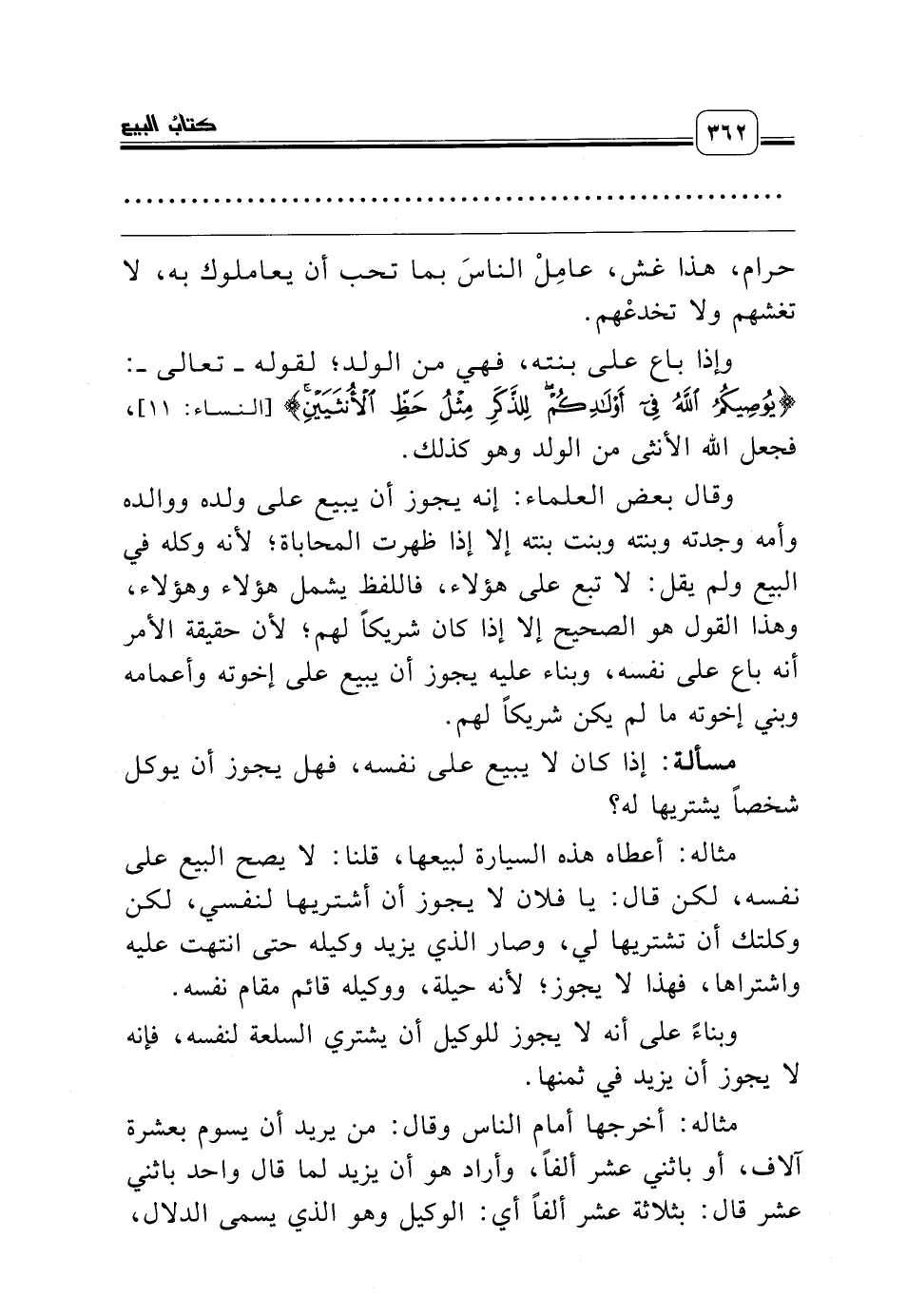 مثاله: أعطاه هذه السيارة لبيعها، قلنا: لا يصح البيع على نفسه، لكن قال: يا فلان لا يجوز أن أشتريها لنفسي، لكن وكلتك أن تشتريها لي، وصار الذي يزيد وكيله حتى انتهت عليه واشتراها، فهذا لا يجوز؛ لأنه حيلة، ووكيله قائم مقام نفسه.