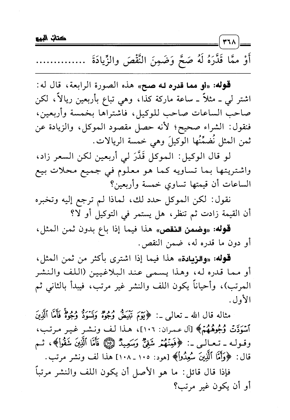 قوله: «والزيادة» هذا فيما إذا اشترى بأكثر من ثمن المثل، أو مما قدره له، وهذا يسمى عند البلاغيين (اللف والنشر المرتب)، وأحياناً يكون اللف والنشر غير مرتب، فيبدأ بالثاني ثم الأول.