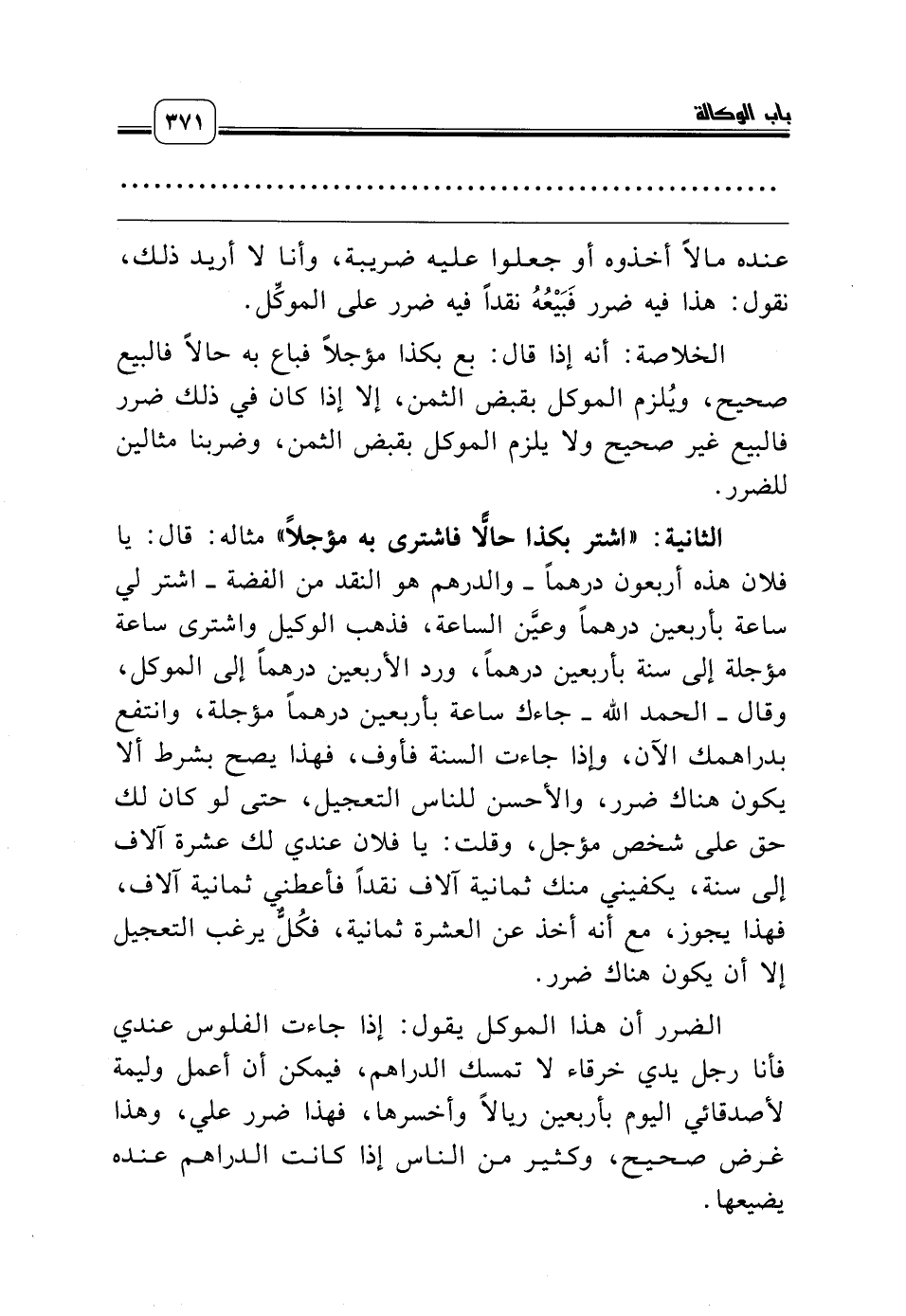 الثانية: «اشتر بكذا حالًّا فاشترى به مؤجلاً» مثاله: قال: يا فلان هذه أربعون درهماً ـ والدرهم هو النقد من الفضة ـ اشتر لي ساعة بأربعين درهماً وعيَّن الساعة، فذهب الوكيل واشترى ساعة مؤجلة إلى سنة بأربعين درهماً، ورد الأربعين درهماً إلى الموكل، وقال ـ الحمد الله ـ جاءك ساعة بأربعين درهماً مؤجلة، وانتفع بدراهمك الآن، وإذا جاءت السنة فأوف، فهذا يصح بشرط ألا يكون هناك ضرر، والأحسن للناس التعجيل، حتى لو كان لك حق على شخص مؤجل، وقلت: يا فلان عندي لك عشرة آلاف إلى سنة، يكفيني منك ثمانية آلاف نقداً فأعطني ثمانية آلاف، فهذا يجوز، مع أنه أخذ عن العشرة ثمانية، فكُلٌّ يرغب التعجيل إلا أن يكون هناك ضرر.