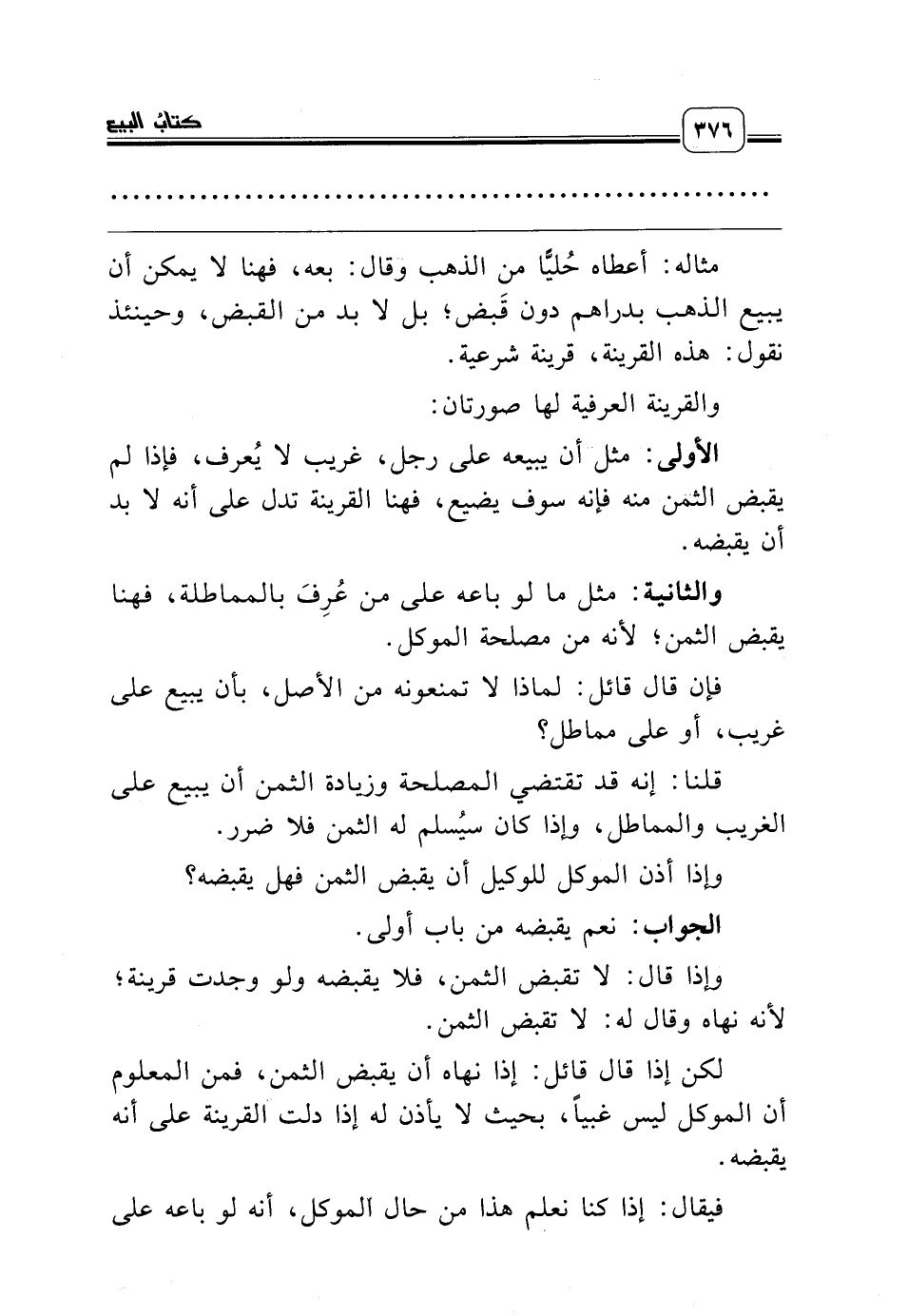 مثاله: أعطاه حُليًّا من الذهب وقال: بعه، فهنا لا يمكن أن يبيع الذهب بدراهم دون قَبض؛ بل لا بد من القبض، وحينئذ نقول: هذه القرينة، قرينة شرعية.