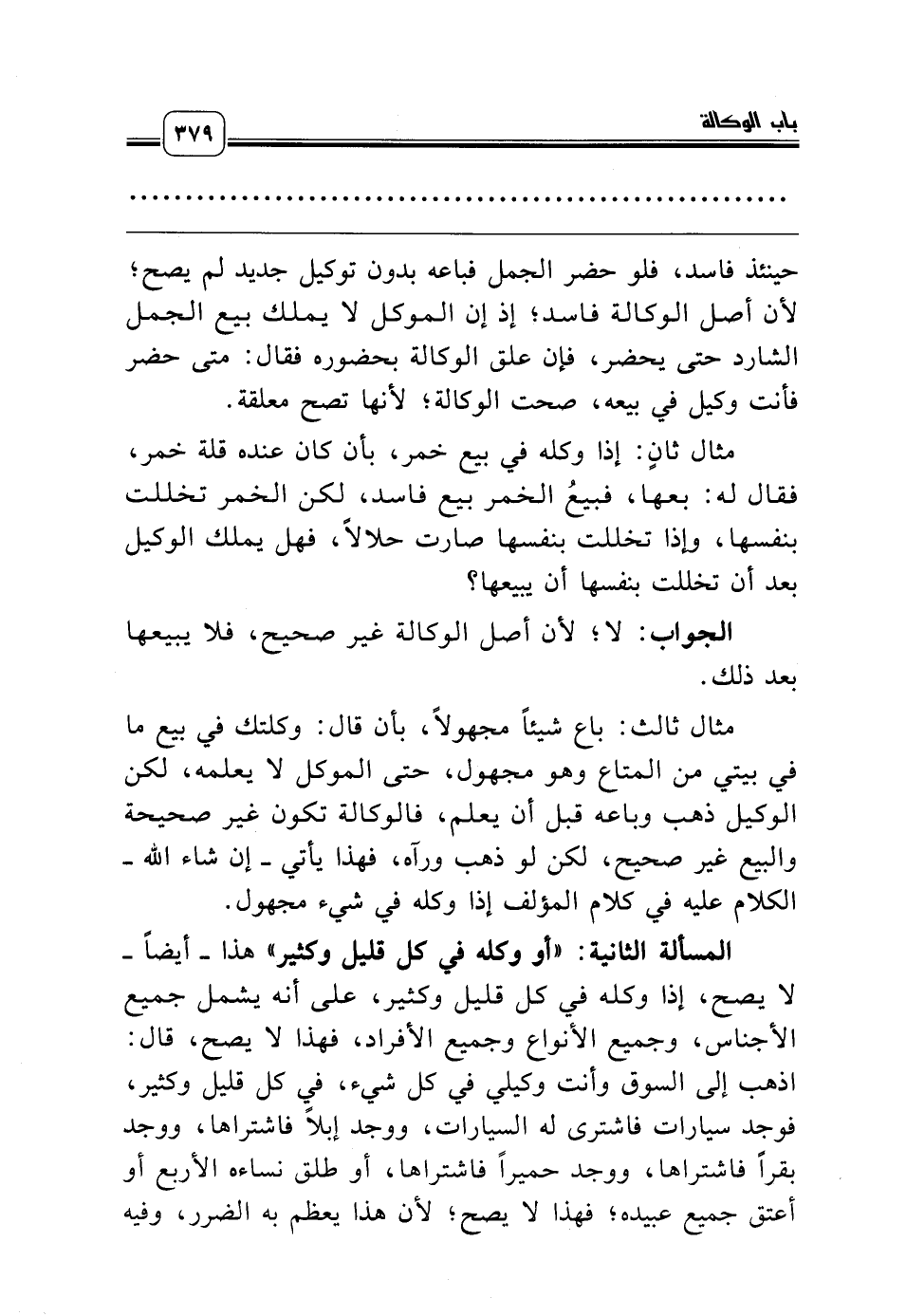 المسألة الثانية: «أو وكله في كل قليل وكثير» هذا ـ أيضاً ـ لا يصح، إذا وكله في كل قليل وكثير، على أنه يشمل جميع الأجناس، وجميع الأنواع وجميع الأفراد، فهذا لا يصح، قال: اذهب إلى السوق وأنت وكيلي في كل شيء، في كل قليل وكثير، فوجد سيارات فاشترى له السيارات، ووجد إبلاً فاشتراها، ووجد بقراً فاشتراها، ووجد حميراً فاشتراها، أو طلق نساءه الأربع أو أعتق جميع عبيده؛ فهذا لا يصح؛ لأن هذا يعظم به الضرر، وفيه