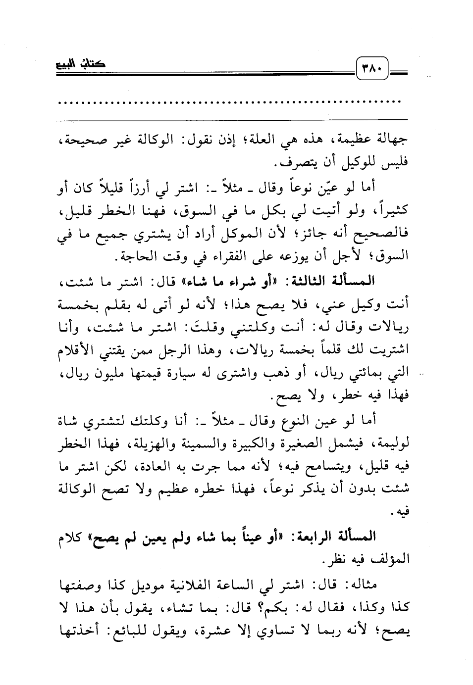 المسألة الثالثة: «أو شراء ما شاء» قال: اشتر ما شئت، أنت وكيل عني، فلا يصح هذا؛ لأنه لو أتى له بقلم بخمسة ريالات وقال له: أنت وكلتني وقلتَ: اشتر ما شئت، وأنا اشتريت لك قلماً بخمسة ريالات، وهذا الرجل ممن يقتني الأقلام التي بمائتي ريال، أو ذهب واشترى له سيارة قيمتها مليون ريال، فهذا فيه خطر، ولا يصح.
