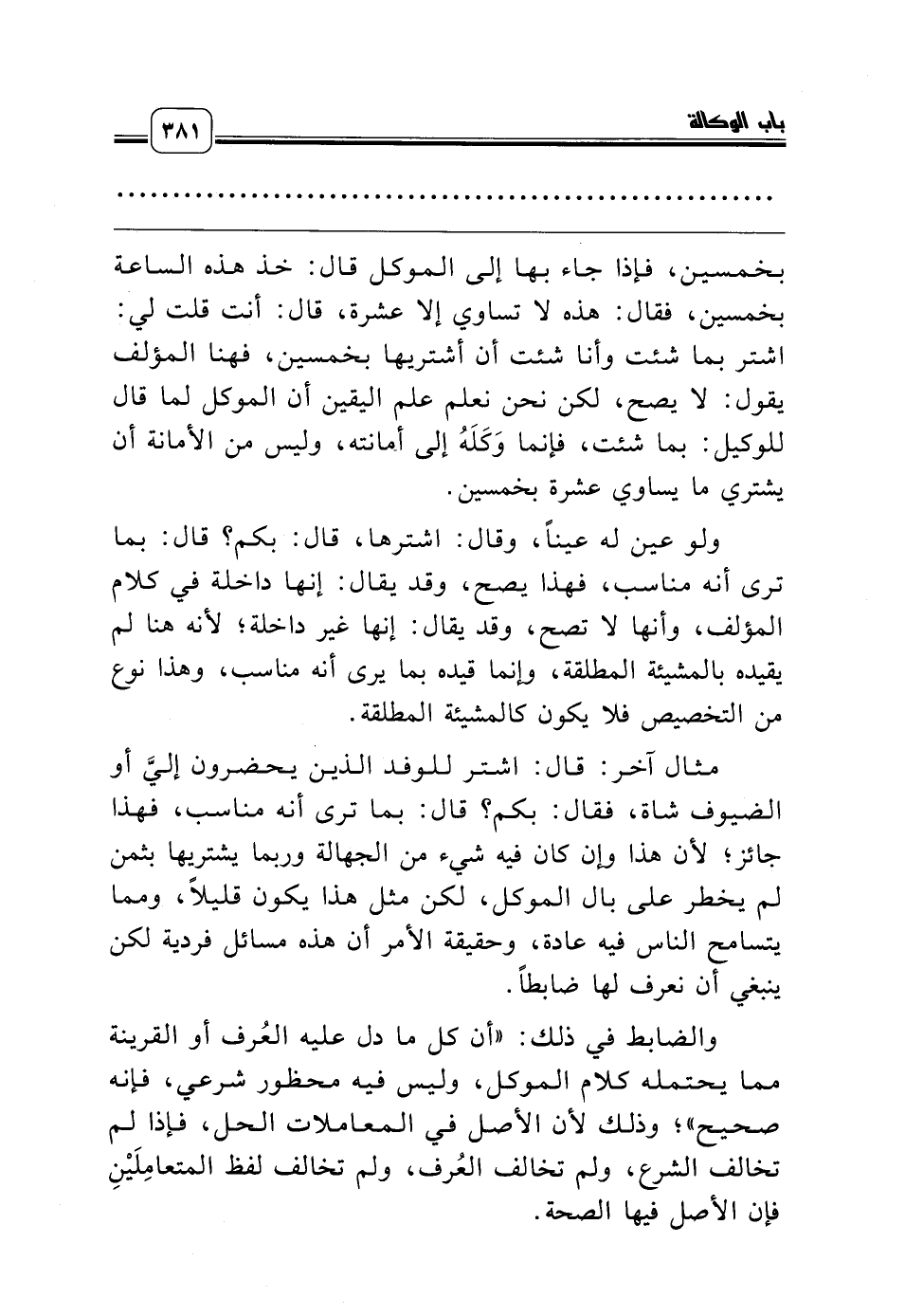 مثال آخر: قال: اشتر للوفد الذين يحضرون إليَّ أو الضيوف شاة، فقال: بكم؟ قال: بما ترى أنه مناسب، فهذا جائز؛ لأن هذا وإن كان فيه شيء من الجهالة وربما يشتريها بثمن لم يخطر على بال الموكل، لكن مثل هذا يكون قليلاً، ومما يتسامح الناس فيه عادة، وحقيقة الأمر أن هذه مسائل فردية لكن ينبغي أن نعرف لها ضابطاً.