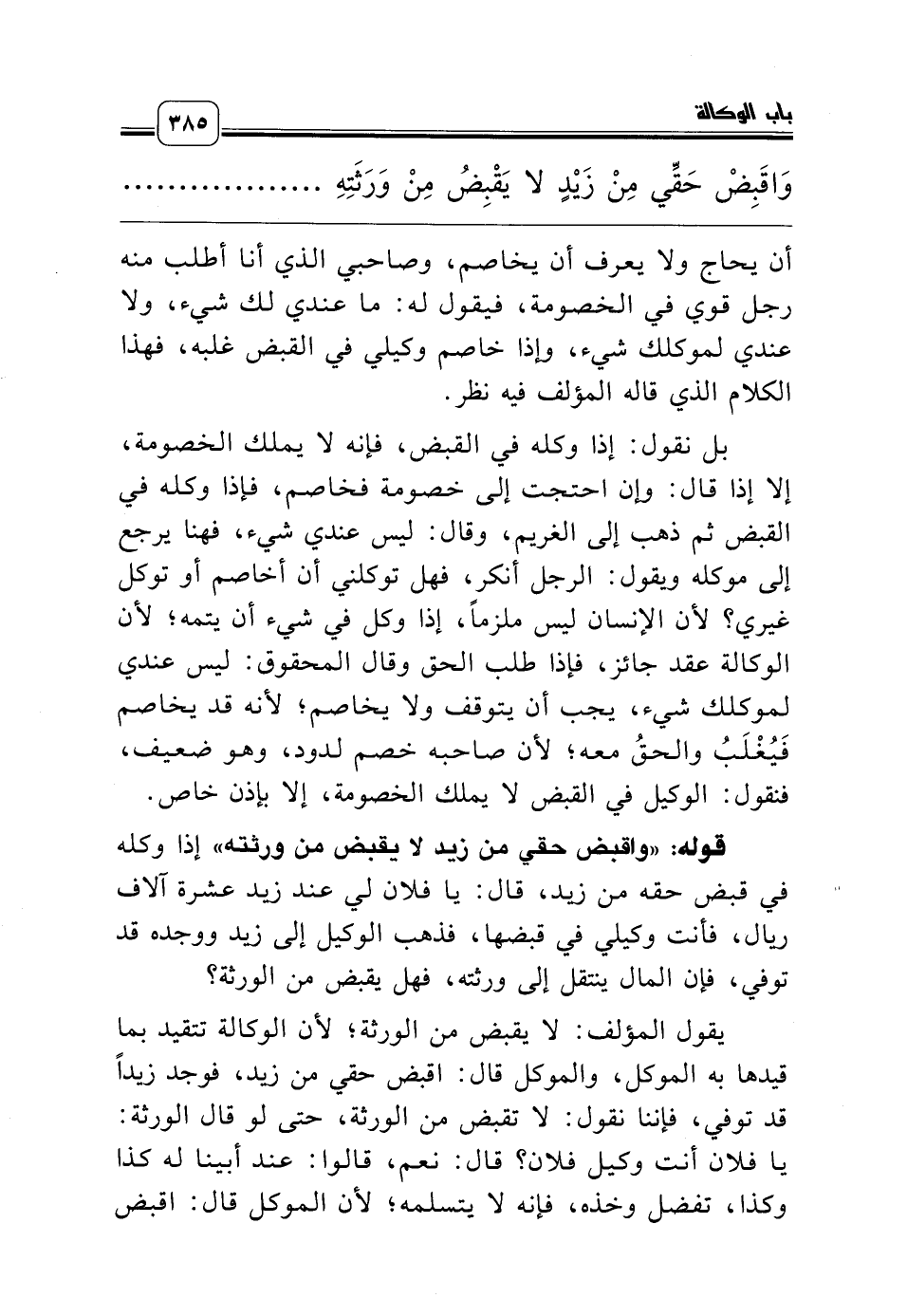 أن يحاج ولا يعرف أن يخاصم، وصاحبي الذي أنا أطلب منه رجل قوي في الخصومة، فيقول له: ما عندي لك شيء، ولا عندي لموكلك شيء، وإذا خاصم وكيلي في القبض غلبه، فهذا الكلام الذي قاله المؤلف فيه نظر.