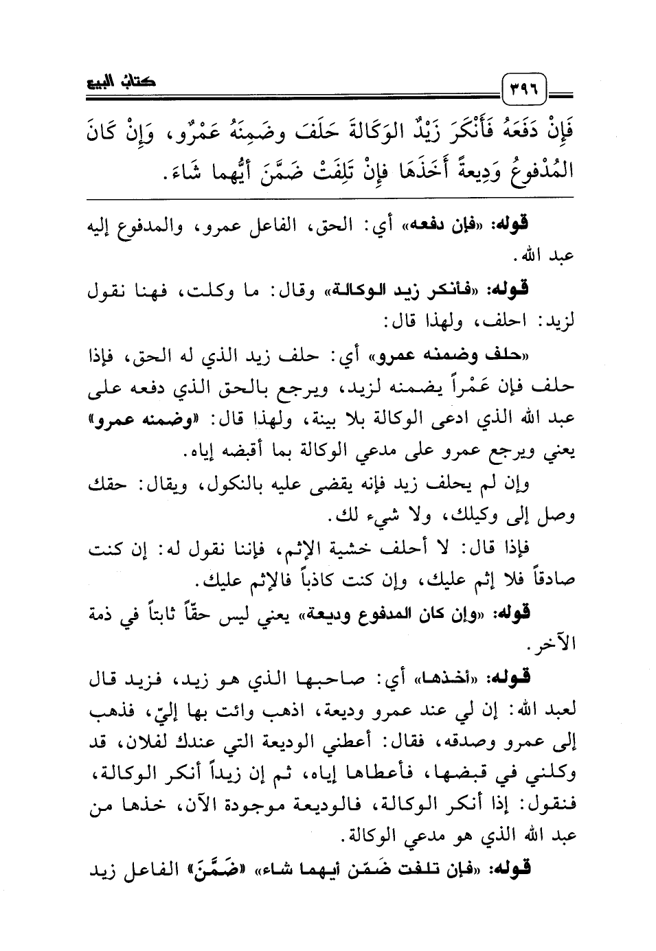 «حلف وضمنه عمرو» أي: حلف زيد الذي له الحق، فإذا حلف فإن عَمْراً يضمنه لزيد، ويرجع بالحق الذي دفعه على عبد الله الذي ادعى الوكالة بلا بينة، ولهذا قال: «وضمنه عمرو» يعني ويرجع عمرو على مدعي الوكالة بما أقبضه إياه.