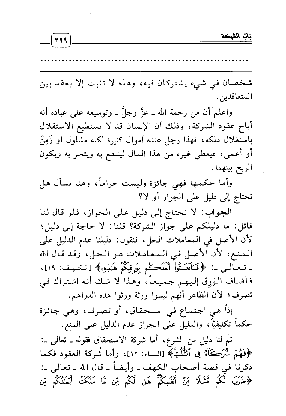 ثم لنا دليل من الشرع، أما شركة الاستحقاق فقوله ـ تعالى ـ: {فَهُمْ شُرَكَاءُ فِي الثُّلُثِ} [النساء: 12]، وأما شركة العقود فكما ذكرنا في قصة أصحاب الكهف ـ وأيضاً ـ قال الله ـ تعالى ـ: {ضَرَبَ لَكُمْ مَثَلاً مِنْ أَنْفُسِكُمْ هَلْ لَكُمْ مِن مَّا مَلَكَتْ أَيْمَانُكُمْ مِنْ