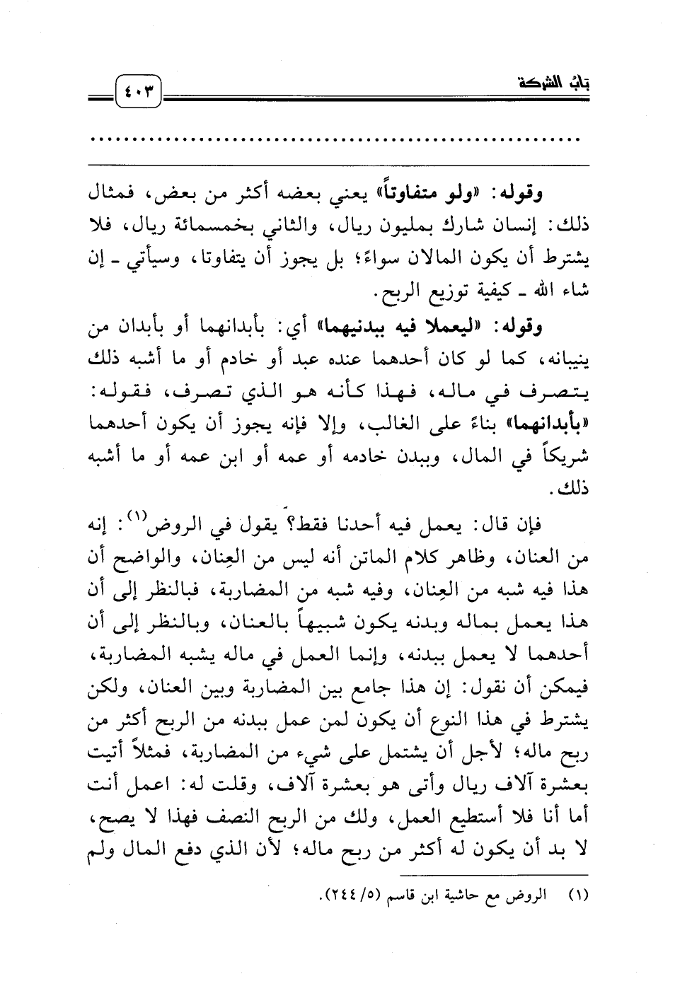 فإن قال: يعمل فيه أحدنا فقط؟ يقول في الروض (¬1): إنه من العنان، وظاهر كلام الماتن أنه ليس من العِنان، والواضح أن هذا فيه شبه من العِنان، وفيه شبه من المضاربة، فبالنظر إلى أن هذا يعمل بماله وبدنه يكون شبيهاً بالعنان، وبالنظر إلى أن أحدهما لا يعمل ببدنه، وإنما العمل في ماله يشبه المضاربة، فيمكن أن نقول: إن هذا جامع بين المضاربة وبين العنان، ولكن يشترط في هذا النوع أن يكون لمن عمل ببدنه من الربح أكثر من ربح ماله؛ لأجل أن يشتمل على شيء من المضاربة، فمثلاً أتيت بعشرة آلاف ريال وأتى هو بعشرة آلاف، وقلت له: اعمل أنت أما أنا فلا أستطيع العمل، ولك من الربح النصف فهذا لا يصح، لا بد أن يكون له أكثر من ربح ماله؛ لأن الذي دفع المال ولم