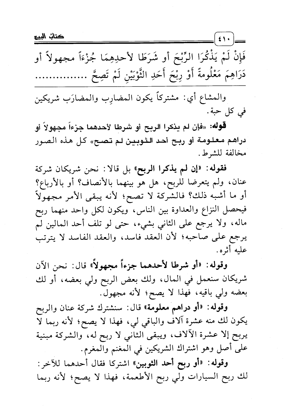 َإِنْ لَمْ يَذْكُرَا الرِّبْحَ أو شَرَطَا لأحدِهِمَا جُزْءَاً مجهولاً أو دَرَاهِمَ مَعْلُومةً أَوْ رِبْحَ أَحَدِ الثَّوْبَيْنِ لَمْ تَصِحَّ وَكَذَا مُسَاقَاةٌ ومُزارعَةٌ ومُضَارَبةٌ ............