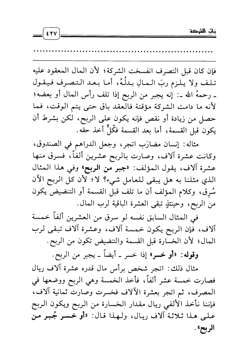مثال ذلك: اتجر شخص برأس مال قدره عشرة آلاف ريال فصارت خمسة عشر ألفاً، فأخذ الخمسة وهي الربح ووضعها في المصرف، ثم اتجر بعشرة الآلاف فخسرت وصارت ثمانية آلاف، فإننا نأخذ الألفي ريال مقدار الخسارة من الربح ويكون الربح على هذا ثلاثة آلاف ريال، ولهذا قال: «أو خسر جُبر من الربح».