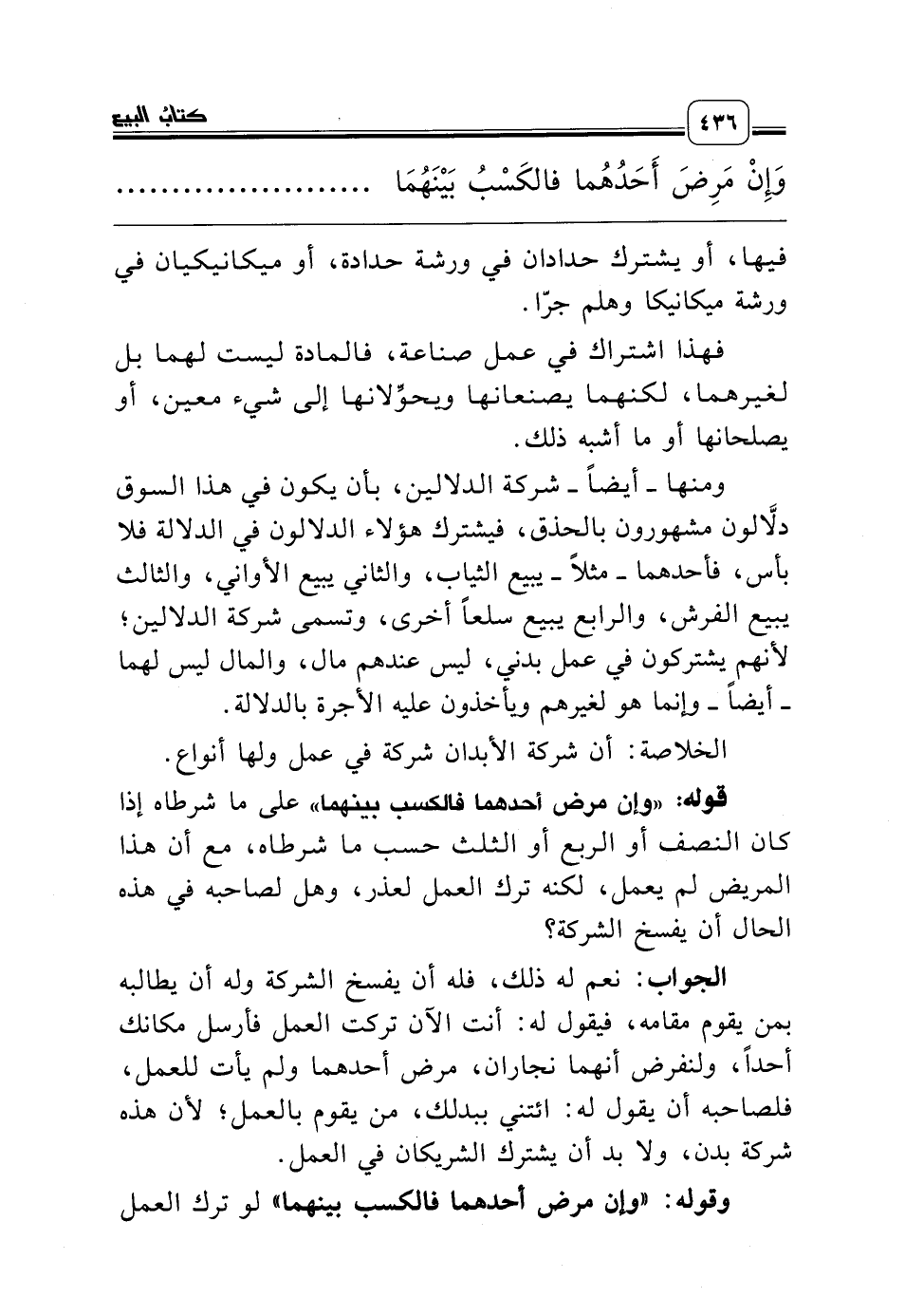 قوله: «وإن مرض أحدهما فالكسب بينهما» على ما شرطاه إذا كان النصف أو الربع أو الثلث حسب ما شرطاه، مع أن هذا المريض لم يعمل، لكنه ترك العمل لعذر، وهل لصاحبه في هذه الحال أن يفسخ الشركة؟