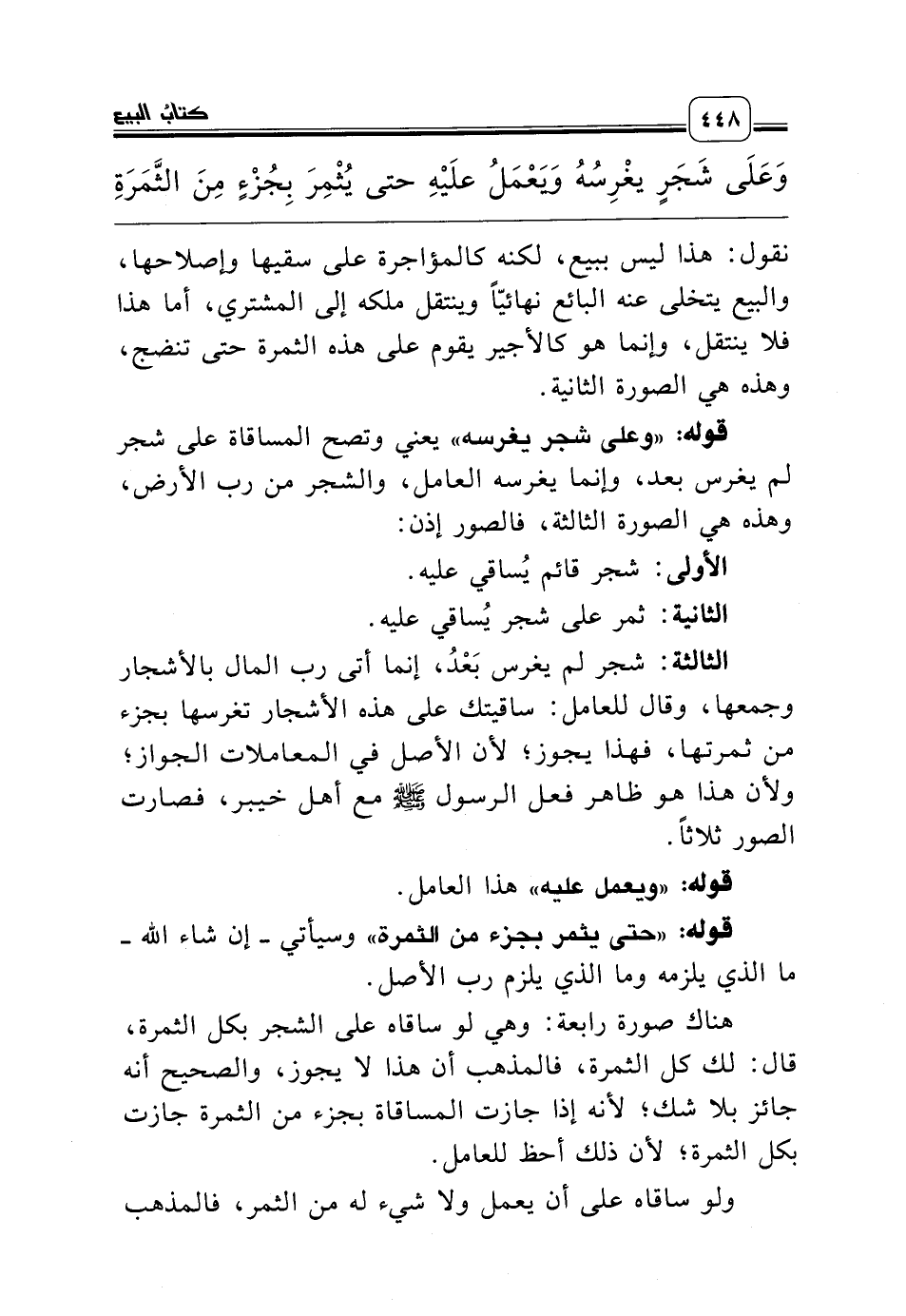 الثالثة: شجر لم يغرس بَعْدُ، إنما أتى رب المال بالأشجار وجمعها، وقال للعامل: ساقيتك على هذه الأشجار تغرسها بجزء من ثمرتها، فهذا يجوز؛ لأن الأصل في المعاملات الجواز؛ ولأن هذا هو ظاهر فعل الرسول صلّى الله عليه وسلّم مع أهل خيبر، فصارت الصور ثلاثاً.