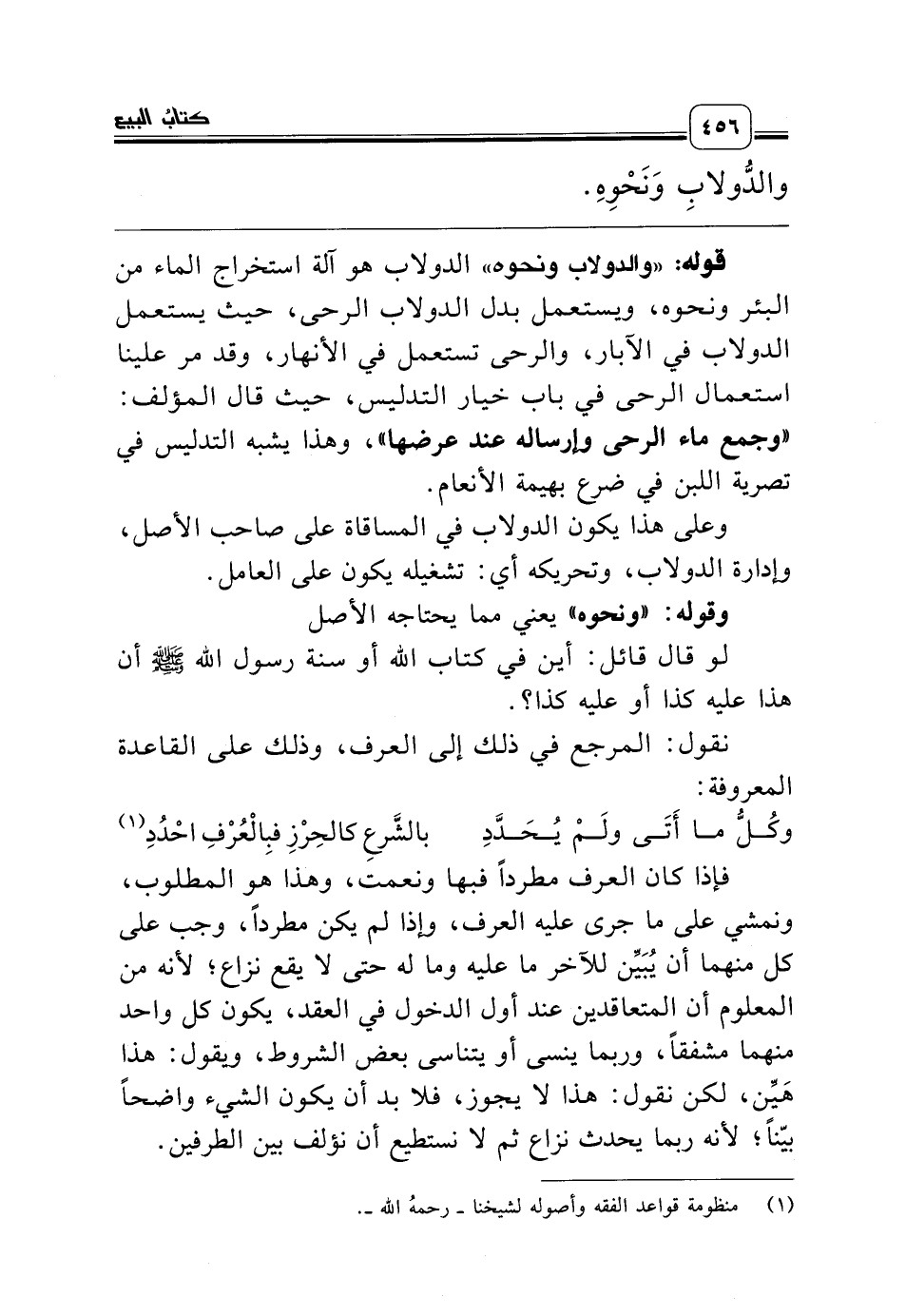 قوله: «والدولاب ونحوه» الدولاب هو آلة استخراج الماء من البئر ونحوه، ويستعمل بدل الدولاب الرحى، حيث يستعمل الدولاب في الآبار، والرحى تستعمل في الأنهار، وقد مر علينا استعمال الرحى في باب خيار التدليس، حيث قال المؤلف: «وجمع ماء الرحى وإرساله عند عرضها»، وهذا يشبه التدليس في تصرية اللبن في ضرع بهيمة الأنعام.