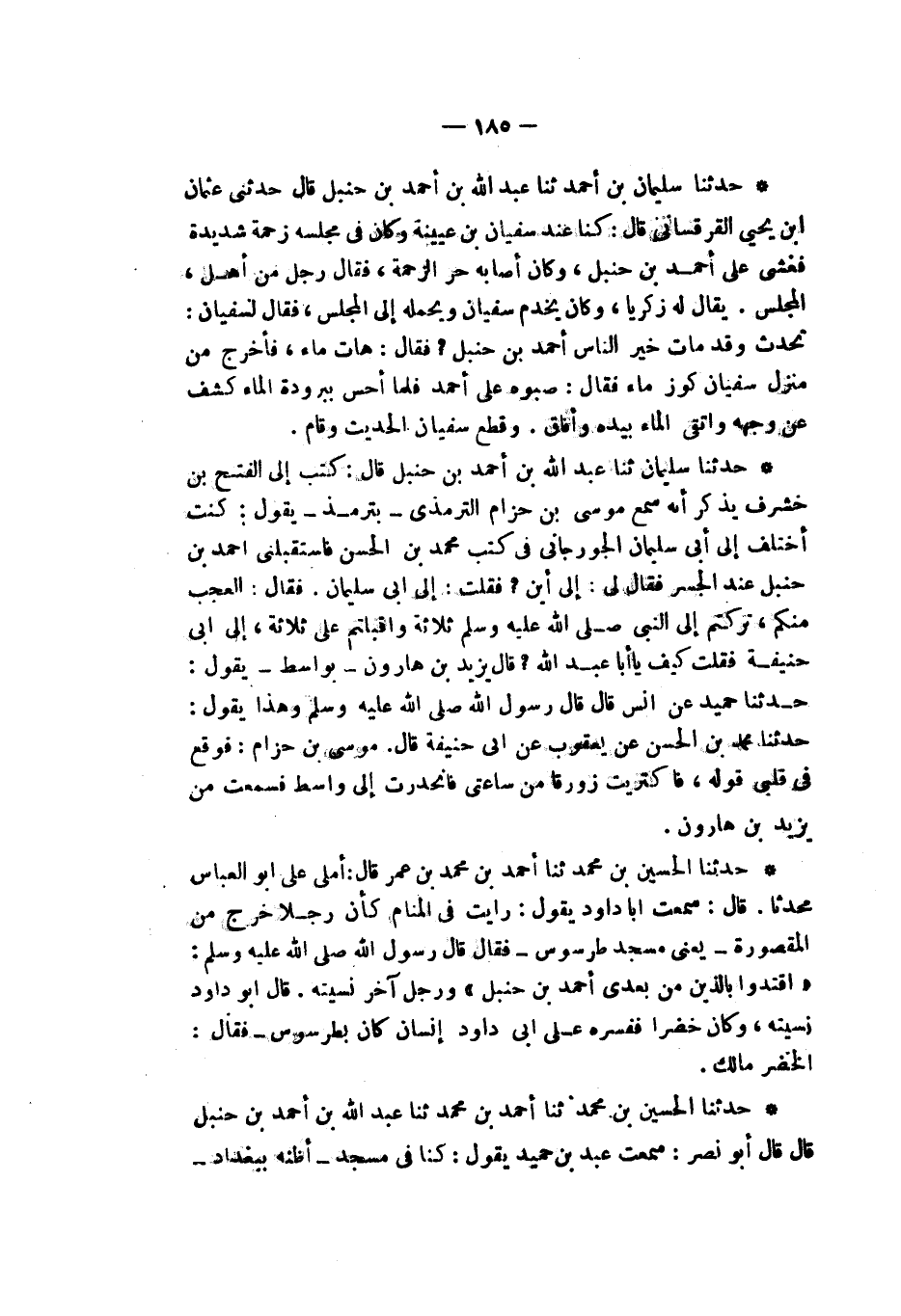 حَدَّثَنَا سُلَيْمَانُ، ثَنَا عَبْدُ اللَّهِ بْنُ أَحْمَدَ بْنِ حَنْبَلٍ، قَالَ: كَتَبَ إِلَيَّ الْفَتْحُ بْنُ خَشْرَفٍ يَذْكُرُ أَنَّهُ سَمِعَ مُوسَى بْنَ حِزَامٍ التِّرْمِذِيَّ - بِتِرْمِذَ - يَقُولُ: «كُنْتُ أَخْتَلِفُ إِلَى أَبِي سُلَيْمَانَ الْجُرْجَانِيِّ فِي كُتُبِ مُحَمَّدِ بْنِ الْحَسَنِ، فَاسْتَقْبَلَنِي أَحْمَدُ بْنُ حَنْبَلٍ عِنْدَ الْجِسْرِ»، فَقَالَ لِي: إِلَى أَيْنَ؟ فَقُلْتُ: «إِلَى أَبِي سُلَيْمَانَ». فَقَالَ: الْعَجَبُ مِنْكُمْ §تَرَكْتُمْ إِلَى النَّبِيِّ صَلَّى اللهُ عَلَيْهِ وَسَلَّمَ ثَلَاثَةً وَأَقْبَلْتُمْ عَلَى ثَلَاثَةٍ، إِلَى أَبِي حَنِيفَةَ، فَقُلْتُ: «كَيْفَ يَا أَبَا عَبْدِ اللَّهِ؟» قَالَ يَزِيدُ بْنُ هَارُونَ - بِوَاسِطَ - يَقُولُ: حَدَثَّنَا حُمَيْدٌ. عَنْ أَنَسٍ قَالَ: قَالَ رَسُولُ اللهِ صَلَّى اللهُ عَلَيْهِ وَسَلَّمَ، وَهَذَا يَقُولُ: حَدَّثَنَا مُحَمَّدُ بْنُ الْحَسَنِ عَنْ يَعْقُوبَ، عَنْ أَبِي حَنِيفَةَ، قَالَ: مُوسَى بْنُ حِزَامٍ: «فَوَقَعَ فِي قَلْبِي قَوْلُهُ فَاكْتَرَيْتُ زَوْرَقًا مِنْ سَاعَتِي فَانْحَدَرْتُ إِلَى وَاسِطَ فَسَمِعْتُ مِنْ يَزِيدَ بْنِ هَارُونَ»