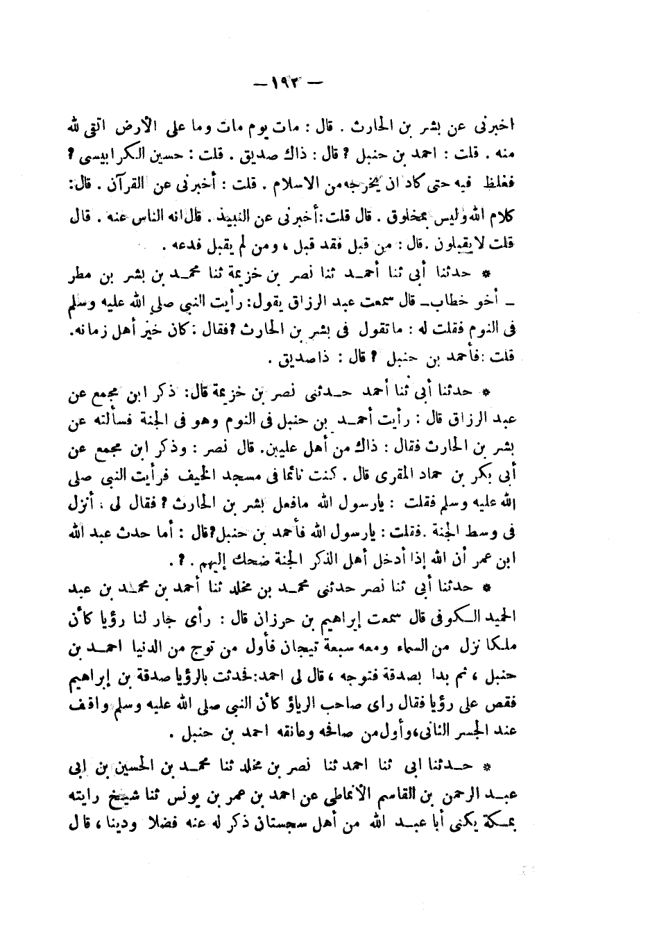 حَدَّثَنَا أَبِي، ثَنَا أَحْمَدُ، ثَنَا نَصْرُ بْنُ خُزَيْمَةَ، ثَنَا مُحَمَّدُ بْنُ بِشْرِ بْنِ مَطَرٍ، أَخُو خَطَّابٍ قَالَ: سَمِعْتُ عَبْدَ الرَّزَّاقِ، يَقُولُ: " رَأَيْتُ النَّبِيَّ صَلَّى اللهُ عَلَيْهِ وَسَلَّمَ فِي النَّوْمِ، فَقُلْتُ لَهُ: مَا تَقُولُ فِي بِشْرِ بْنِ الْحَارِثِ. فَقَالَ: §كَانَ خَيْرَ أَهْلِ زَمَانِهِ، قُلْتُ: فَأَحْمَدُ بْنُ حَنْبَلٍ، قَالَ: ذَا صِدِّيقٌ "