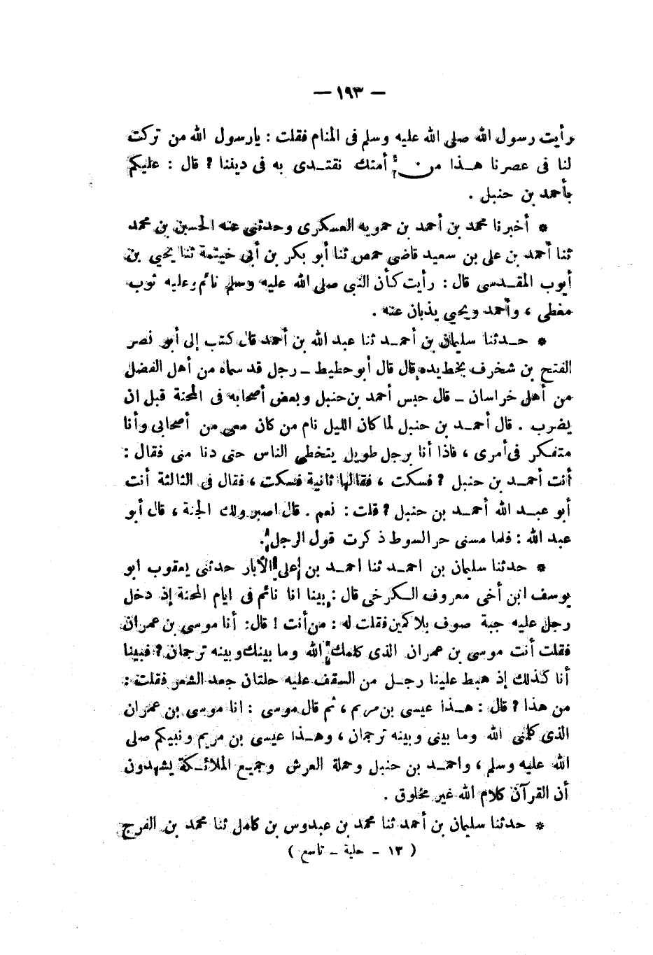 حَدَّثَنَا سُلَيْمَانُ بْنُ أَحْمَدَ، ثَنَا أَحْمَدُ بْنُ عَلِيٍّ الْأَبَّارُ، حَدَّثَنِي يَعْقُوبُ أَبُو يُوسُفَ ابْنُ أَخِي مَعْرُوفٍ الْكَرْخِيُّ، قَالَ: " بَيْنَمَا أَنَا نَائِمٌ فِي أَيَّامِ الْمِحْنَةِ , إِذْ دَخَلَ رَجُلٌ عَلَيْهِ جُبَّةُ صُوفٍ بِلَا كَمِينٍ فَقُلْتُ لَهُ: مَنْ أَنْتَ؟ قَالَ: أَنَا مُوسَى بْنُ عِمْرَانَ، فَقُلْتُ: أَنْتَ مُوسَى بْنُ عِمْرَانَ الَّذِي كَلَّمَكَ اللَّهُ وَمَا بَيْنَكَ وَبَيْنَهُ تُرْجُمَانٌ، فَبَيْنَمَا أَنا كَذَلِكَ إِذْ هَبَطَ عَلَيْنَا رَجُلٌ مِنَ السَّقْفِ عَلَيْهِ حُلَّتَانِ جَعْدُ الشَّعْرِ فَقُلْتُ: مَنْ هَذَا؟ قَالَ: هَذَا عِيسَى ابْنُ مَرْيَمَ، ثُمَّ قَالَ مُوسَى: أَنَا مُوسَى بْنُ عِمْرَانَ الَّذِي كَلَّمَنِي اللَّهُ وَمَا بَيْنِي وَبَيْنَهُ تُرْجُمَانٌ، وَهَذَا عِيسَى ابْنُ مَرْيَمَ، وَنَبِيُّكُمْ صَلَّى اللهُ عَلَيْهِ وَسَلَّمَ وَأَحْمَدُ بْنُ حَنْبَلٍ وَحَمَلَةُ الْعَرْشِ وَجَمِيعُ الْمَلَائِكَةِ يَشْهَدُونَ أَنَّ §الْقُرْآنَ كَلَامُ اللَّهِ غَيْرُ مَخْلُوقٍ "