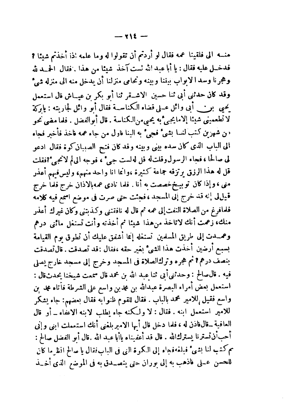 حَدَّثَنِي أَبِي، ثنا حُسَيْنٌ الْأَشْقَرُ، ثنا أَبُو بَكْرِ بْنُ عَيَّاشٍ، قَالَ: اسْتُعْمِلَ يَحْيَى بْنُ أَبِي وَائِلٍ عَلَى قَضَاءِ الْكُنَاسَةِ. فَقَالَ أَبُو وَائِلٍ لِجَارِيَتِهِ: يَا بَرَكَةُ لَا تُطْعِمِينِي شَيْئًا إِلَّا مَا يَجِيءُ بِهِ يَحْيَى مِنَ الْكُنَاسَةِ. قَالَ أَبُو الْفَضْلِ: " فَلَمَّا مَضَى نَحْوُ مِنْ شَهْرَيْنِ كَتَبَ لَنَا بِشَيْءٍ فَجِيءَ بِهِ إِلَيْنَا فَأَوَّلُ مَنْ جَاءَ عَمُّهُ فَأَخَذَ، فَأُخْبِرَ فَجَاءَ إِلَى الْبَابِ الَّذِي كَانَ سَدَّهُ بَيْنِي وَبَيْنَهُ، وَقَدْ كَانَ فَتَحَ الصِّبْيَانُ كُوَّةً، فَقَالَ: ادْعُوا لِي صَالِحًا فَجَاءَ الرَّسُولُ وَقُلْتُ لَهُ: قُلْ لَهُ لَسْتُ أَجِيءُ , فَوَجَّهَ إِلَيَّ لِمَ لَا تَجِيءُ؟ فَقُلْتُ: قُلْ لَهُ هَذَا الرِّزْقُ يَرْتَزِقُهُ جَمَاعَةٌ كَثِيرَةٌ وَإِنَّمَا أَنَا وَاحِدٌ مِنْهُمْ، وَلَيْسَ فِيهِمْ أَعْذَرُ مِنِّي وَإِذَا كَانَ تَوْبِيخٌ خُصِصْتُ بِهِ أَنَا. فَلَمَّا نَادَى عَمُّهُ بِالْأَذَانِ خَرَجَ، فَلَمَّا خَرَجَ قِيلَ لِي إِنَّهُ قَدْ خَرَجَ إِلَى الْمَسْجِدِ فَجِئْتُ حَتَّى صِرْتُ فِي مَوْضِعٍ أَسْمَعُ فِيهِ كَلَامَهُ، فَلَمَّا فَرَغَ مِنَ الصَّلَاةِ الْتَفَتَ إِلَى عَمِّهِ، ثُمَّ قَالَ لَهُ: نَافَقْتَنِي وَكَذَبْتَنِي وَكَانَ غَيْرُكَ أَعْذَرُ مِنْكَ، زَعَمْتَ أَنَّكَ لَا تَأْخُذُ مِنْ هَذَا شَيْئًا ثُمَّ أَخَذْتَهُ، وَأَنْتَ تَسْتَغِلُّ مِائَتَيْ دِرْهَمٍ وَعَمَدْتَ إِلَى طَرِيقِ الْمُسْلِمِينَ تَسْتَغِلُّهُ، إِنَّمَا §أُشْفِقُ عَلَيْكَ أَنْ تُطَوَّقَ يَوْمَ الْقِيَامَةِ بِسَبْعِ أَرَضِينَ، أَخَذْتَ هَذَا الشَّيْءَ بِغَيْرِ حَقِّهِ، فَقَالَ: قَدْ تَصَدَّقْتُ. قَالَ تَصَدَّقْتَ بِنِصْفِ دِرْهَمٍ ثُمَّ هَجَرَهُ وَتَرَكَ الصَّلَاةَ فِي الْمَسْجِدِ، وَخَرَجَ إِلَى مَسْجِدٍ خَارِجٍ يُصَلِّي فِيهِ "