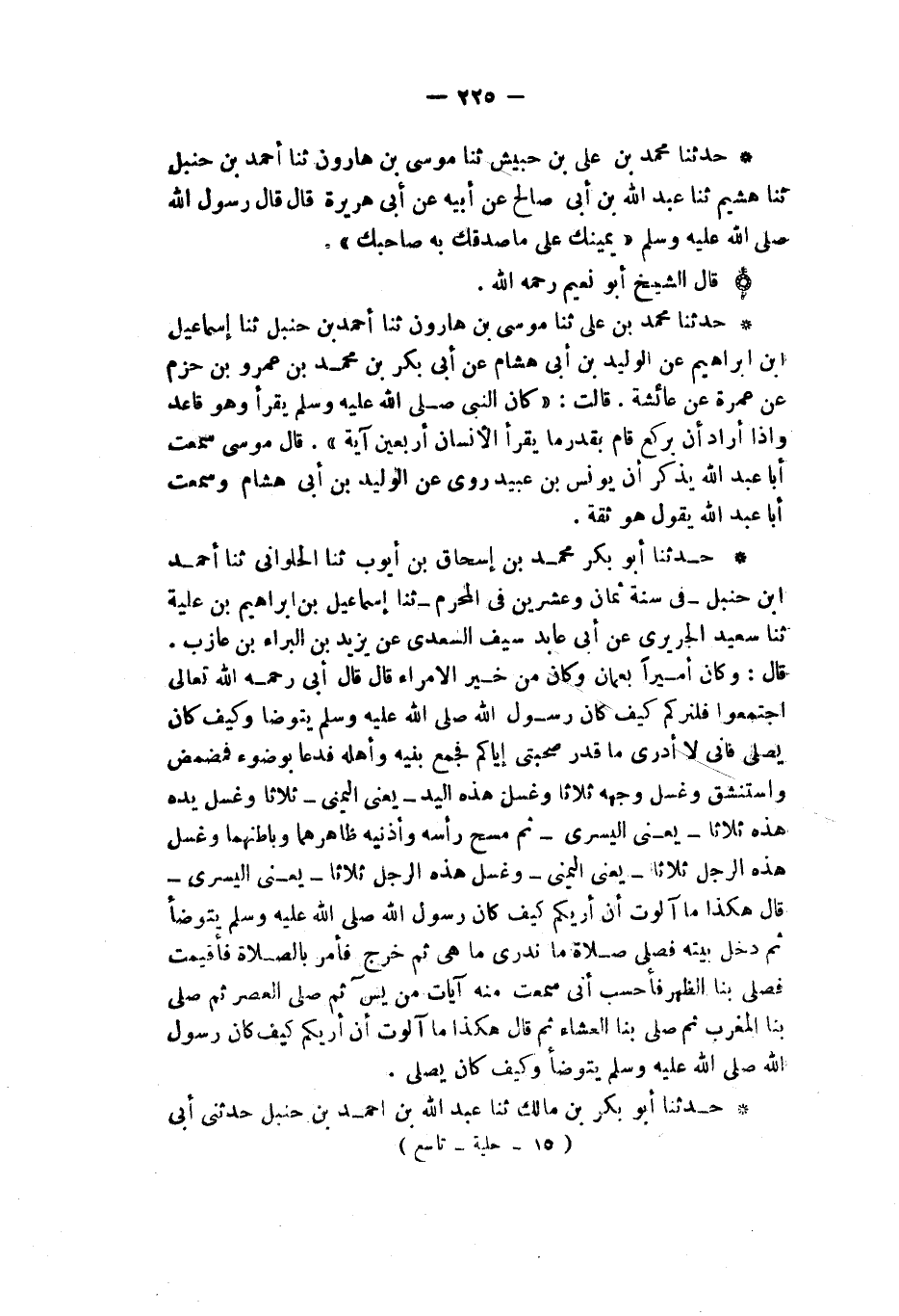حَدَّثَنَا أَبُو بَكْرٍ مُحَمَّدُ بْنُ إِسْحَاقَ بْنِ أَيُّوبَ، ثنا الْحُلْوَانِيُّ، ثنا أَحْمَدُ بْنُ حَنْبَلٍ، - فِي سَنَةِ ثَمَانٍ وَعِشْرِينَ فِي الْمُحَرَّمِ - ثنا إِسْمَاعِيلُ بْنُ إِبْرَاهِيمَ بْنِ عُلَيَّةَ، ثنا سَعِيدٌ الْجُرَيْرِيُّ، عَنْ أَبِي عَائِذٍ سَيْفٍ السَّعْدِيِّ، عَنْ يَزِيدَ بْنِ الْبَرَاءِ بْنِ عَازِبٍ - قَالَ وَكَانَ أَمِيرًا بِعُمَانَ وَكَانَ مِنْ خَيْرِ الْأُمَرَاءِ - قَالَ: قَالَ أَبِي رَحِمَهُ اللَّهُ تَعَالَى: اجْتَمِعُوا فَلْنُرِكُمْ كَيْفَ كَانَ رَسُولُ اللَّهِ صَلَّى اللهُ عَلَيْهِ وَسَلَّمَ يَتَوَضَّأُ وَكَيْفَ كَانَ يُصَلِّي فَإِنِّي لَا أَدْرِي مَا قَدْرُ صُحْبَتِي إِيَّاكُمْ، فَجَمَعَ بَنِيهِ وَأَهْلَهُ §فَدَعَا بِوَضُوءٍ فَمَضْمَضَ وَاسْتَنْشَقَ وَغَسَلَ وَجْهَهُ ثَلَاثًا وَغَسَلَ هَذِهِ الْيَدَ - يَعْنِي الْيمْنَى - ثَلَاثًا وَغَسَلَ يَدَهُ هَذِهِ ثَلَاثًا - يَعْنِي الْيُسْرَى - ثُمَّ مَسَحَ رَأْسَهُ وَأُذُنَيْهِ ظَاهِرَهُمَا وَبَاطِنَهُمَا، وَغَسَلَ هَذِهِ الرِّجْلَ ثَلَاثًا - يَعْنِي الْيمْنَى - وَغَسَلَ هَذِهِ الرِّجْلَ ثَلَاثًا - يَعْنِي الْيُسْرَى -، قَالَ: هَكَذَا مَا آلَوْتُ أَنْ أُرِيَكُمْ كَيْفَ كَانَ رَسُولُ اللَّهِ صَلَّى اللهُ عَلَيْهِ وَسَلَّمَ يَتَوَضَّأُ، ثُمَّ دَخَلَ بَيْتَهُ فَصَلَّى صَلَاةً مَا نَدْرِي مَا هِيَ، ثُمَّ خَرَجَ فَأَمَرَ بِالصَّلَاةِ فَأُقِيمَتْ فَصَلَّى بِنَا الظُّهْرَ فَأَحْسِبُ أَنِّي سَمِعْتُ مِنْهُ آيَاتٍ مِنْ يس، ثُمَّ صَلَّى الْعَصْرَ، ثُمَّ صَلَّى بِنَا الْمَغْرِبَ، ثُمَّ صَلَّى بِنَا الْعِشَاءَ، ثُمَّ قَالَ: هَكَذَا مَا آلَوْتُ أَنْ أُرِيَكُمْ كَيْفَ كَانَ رَسُولُ اللَّهِ صَلَّى اللهُ عَلَيْهِ وَسَلَّمَ يَتَوَضَّأُ وَكَيْفَ كَانَ يُصَلِّي