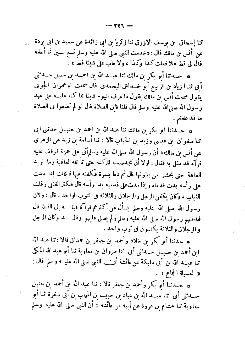 حَدَّثَنَا أَبُو بَكْرِ بْنُ مَالِكٍ، ثنا عَبْدُ اللَّهِ بْنُ أَحْمَدَ بْنِ حَنْبَلٍ، حَدَّثَنِي أَبِي، ثنا صَفْوَانُ بْنُ عِيسَى , وَزَيْدُ بْنُ الْحُبَابِ، قَالَا: ثنا أُسَامَةُ بْنُ زَيْدٍ، عَنِ الزُّهْرِيِّ، عَنْ أَنَسِ بْنِ مَالِكٍ أَنَّ رَسُولَ اللَّهِ صَلَّى اللهُ عَلَيْهِ وَسَلَّمَ أَتَى عَلَى حَمْزَةَ فَوَقَفَ عَلَيْهِ فَرَآهُ قَدْ مُثِّلَ بِهِ فَقَالَ: «§لَوْلَا أَنْ نَجِدَ صَعْبَةً لَتَرَكْتُهُ حَتَّى تَأْكُلَهُ الْعَافِيَةُ - وَمَا نُرِيدُ الْعَاهَةَ - حَتَّى يُحْشَرَ مِنْ بُطُونِهَا» قَالَ: ثُمَّ دَعَا بِنَمِرَةٍ فَكَفَّنَهُ فِيهَا فَكَانَتْ إِذَا مُدَّتْ عَلَى رَأْسِهِ بَدَتْ قَدَمَاهُ وَإِذَا مُدَّتْ عَلَى قَدَمَيْهِ بَدَا رَأْسُهُ، قَالَ فَكَثُرَ الْقَتْلَى وَقَلَّتِ الثِّيَابُ، وَكَانَ يُكَفَّنُ الرَّجُلُ وَالرَّجُلَانِ وَالثَّلَاثَةُ فِي الثَّوْبِ الْوَاحِدِ، قَالَ: وَكَانَ رَسُولُ اللَّهِ صَلَّى اللهُ عَلَيْهِ وَسَلَّمَ يَسْأَلُ عَنْ أَكْثَرِهِمْ قُرْآنًا فَيُقَدِّمُهُ إِلَى الْقِبْلَةِ، قَالَ فَدَفَنَهُمْ رَسُولُ اللَّهِ صَلَّى اللهُ عَلَيْهِ وَسَلَّمَ وَلَمْ يُصَلِّ عَلَيْهِمْ، وَقَالَ زَيْدٌ: وَكَانَ الرَّجُلُ وَالرَّجُلَانِ وَالثَّلَاثَةُ يُكَفَّنُونَ فِي ثَوْبٍ وَاحِدٍ