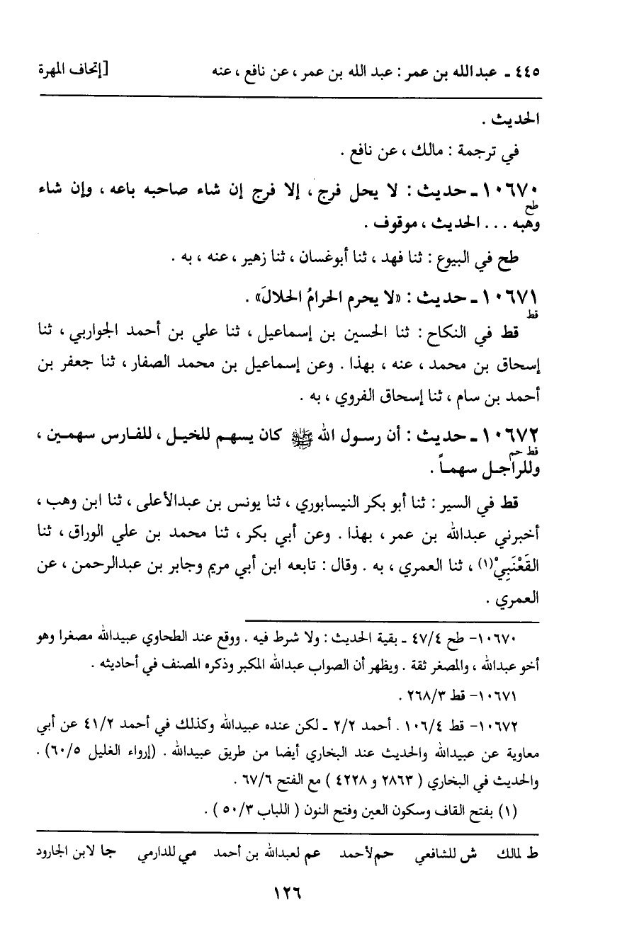 10672 - حَدِيثٌ (قط حم) : أَنَّ رَسُولَ اللَّهِ، صَلَّى اللَّهُ عَلَيْهِ وَسَلَّمَ، كَانَ يُسْهِمُ لِلْخَيْلِ , لِلْفَارِسِ سَهْمَيْنِ , وَلِلرَّاجِلِ سَهْمًا. قط فِي السِّيَرِ: ثنا أَبُو بَكْرٍ النَّيْسَابُورِيُّ , ثنا يُونُسُ بْنُ عَبْدِ الأَعْلَى , ثنا ابْنُ وَهْبٍ , أَخْبَرَنِي عَبْدُ اللَّهِ بْنُ عُمَرَ , بِهَذَا. وَعَنْ أَبِي بَكْرٍ , ثنا مُحَمَّدُ بْنُ عَلِيٍّ الْوَرَّاقُ , ثنا الْقَعْنَبِيُّ , ثنا الْعُمَرِيُّ , بِهِ. وَقَالَ: تَابَعَهُ ابْنُ أَبِي مَرْيَمَ , وَجَابِرُ بْنُ عَبْدِ الرَّحْمَنِ , عَنِ الْعُمَرِيِّ.