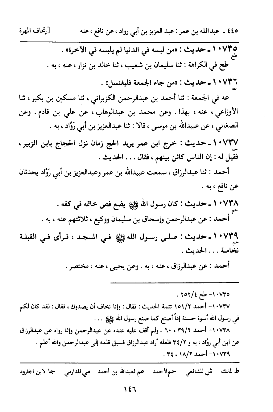 10736 - حَدِيثٌ (عه) : " مَنْ جَاءَ الْجُمُعَةَ فَلْيَغْتَسِلْ ". عه فِي الْجُمُعَةِ: ثنا أَحْمَدُ بْنُ عَبْدِ الرَّحْمَنِ الْكُزْبُرَانِيُّ , ثنا مِسْكِينُ بْنُ بُكَيْرٍ , ثنا الأَوْزَاعِيُّ , عَنْهُ , بِهَذَا. وَعَنْ مُحَمَّدِ بْنِ عَبْدِ الْوَهَّابِ , عَنْ عَلِيِّ بْنِ قَادِمٍ. وَعَنِ الصَّغَانِيِّ , عَنْ عُبَيْدِ اللَّهِ بْنِ مُوسَى , قَالا: ثنا عَبْدُ الْعَزِيزِ بْنُ أَبِي رَوَّادٍ , بِهِ.