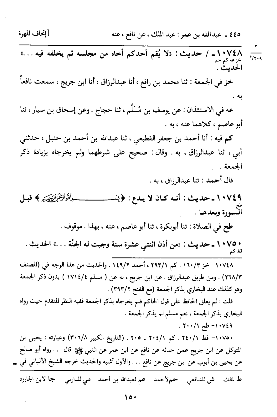 10748 - حَدِيثٌ (خز عه كم حم) : " لا يُقِمْ أَحَدٌ أَخَاهُ مِنْ مَجْلِسِهِ ثُمَّ يَخْلُفْهُ فِيهِ ... " الْحَدِيثُ. خز فِي الْجُمُعَةِ: ثنا مُحَمَّدُ بْنُ رَافِعٍ , أَنَا عَبْدُ الرَّزَّاقِ , أَنَا ابْنُ جُرَيْجٍ , سَمِعْتُ نَافِعًا، بِهِ. عه فِي الاسْتِئْذَانِ: عَنْ يُوسُفَ بْنِ مُسَلَّمٍ , ثنا حَجَّاجٌ. وَعَنْ إِسْحَاقَ بْنِ سَيَّارٍ , ثنا أَبُو عَاصِمٍ , كِلاهُمَا عَنْهُ , بِهِ. كم فِيهِ: أَنَا أَحْمَدُ بْنُ جَعْفَرٍ الْقَطِيعِيُّ , ثنا عَبْدُ اللَّهِ بْنُ أَحْمَدَ بْنِ حَنْبَلٍ , حَدَّثَنِي أَبِي , ثَنا عَبْدُ الرَّزَّاقِ , بِهِ. وَقَالَ: صَحِيحٌ عَلَى شَرْطِهِمَا وَلَمْ يُخَرِّجَاهُ بِزِيَادَةِ ذِكْرِ الْجُمُعَةِ. قَالَ أَحْمَدُ: ثنا عَبْدُ الرَّزَّاقِ , بِهِ.