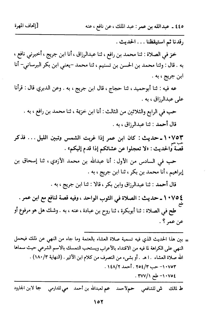10753 - حَدِيثٌ (حب حم) : كَانَ ابْنُ عُمَرَ إِذَا غَرَبَتِ الشَّمْسُ وَتَبَيَّنَ اللَّيْلُ ... فَذَكَرَ قِصَّةً، وَالْحَدِيثُ: " لا تَعْجَلُوا عَنْ عَشَائِكُمْ إِذَا قُدِّمَ إِلَيْكُمْ ". حب فِي السَّادِسِ مِنَ الأَوَّلِ: أَنَا عَبْدُ اللَّهِ بْنُ مُحَمَّدٍ الأَزْدِيُّ , ثنا إِسْحَاقُ بْنُ إِبْرَاهِيمَ , أَنَا مُحَمَّدُ بْنُ بَكْرٍ , ثنا ابْنُ جُرَيْجٍ , بِهِ. قَالَ أَحْمَدُ: ثنا عَبْدُ الرَّزَّاقِ , وَابْنُ بَكْرٍ , قَالا: ثنا ابْنُ جُرَيْجٍ , بِهِ.