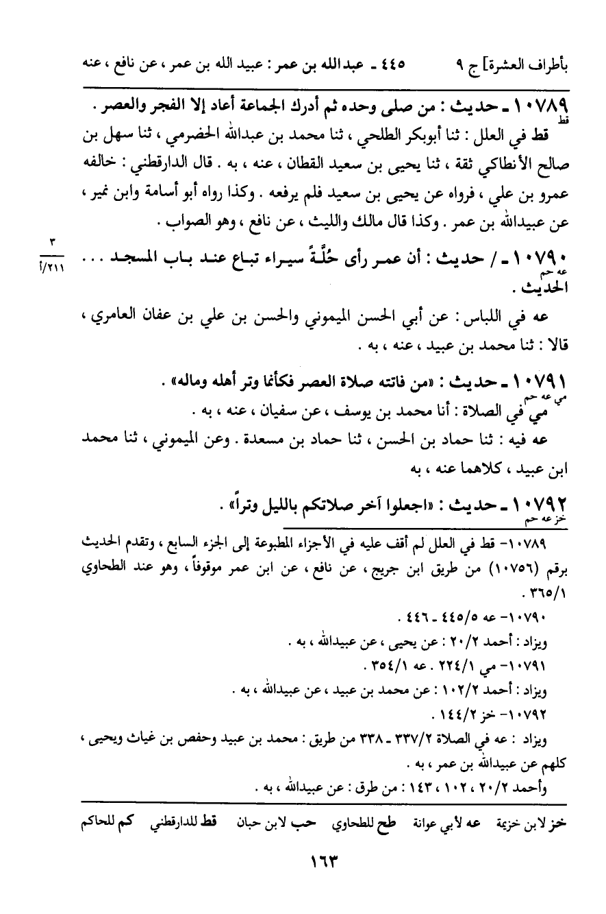 10789 - حَدِيثٌ (قط) : مَنْ صَلَّى وَحْدَهُ ثُمَّ أَدَرَك الْجَمَاعَةَ أَعَادَ إِلا الْفَجْرَ وَالْعَصْرَ. قط فِي الْعِلَلِ: ثنا أَبُو بَكْرٍ الطَّلْحِيُّ، ثنا مُحَمَّدُ بْنُ عَبْدِ اللَّهِ الْحَضْرَمِيُّ، ثنا سَهْلُ بْنُ صَالِحٍ الأَنْطَاكِيُّ ثِقَةٌ، ثنا يَحْيَى بْنِ سَعِيدٍ الْقَطَّانُ، عَنْهُ، بِهِ. قَالَ الدَّارَقُطْنِيُّ: خَالَفَهُ عَمْرُو بْنُ عَلِيٍّ، فَرَوَاهُ عَنْ يَحْيَى بْنِ سَعِيدٍ فَلَمْ يَرْفَعْهُ. وَكَذَا رَوَاهُ أَبُو أُسَامَةَ، وَابْنُ نُمَيْرٍ، عَنْ عُبَيْدِ اللَّهِ بْنِ عُمَرَ. وَكَذَا قَالَ مَالِكٌ، وَاللَّيْثُ، عَنْ نَافِعٍ، هُوَ الصَّوَابُ.