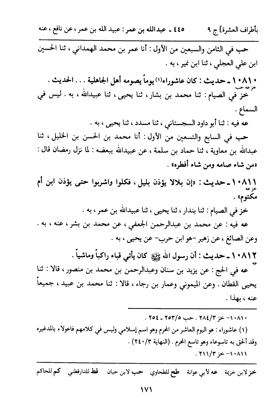 10810 - حَدِيثٌ (خز عه حب) : كَانَ عَاشُورَاءُ يَوْمًا يَصُومُهُ أَهْلُ الْجَاهِلِيَّةِ ... " الْحَدِيثُ. خز فِي الصِّيَامِ: ثنا مُحَمَّدُ بْنُ بَشَّارٍ، ثنا يَحْيَى، ثنا عُبَيْدُ اللَّهِ، بِهِ. لَيْسَ فِي السَّمَاعِ. عه فِيهِ: ثنا أَبُو دَاوُدَ السِّجِسْتَانِيُّ، ثنا مُسَدِّدٌ، ثنا يَحْيَى، بِهِ. حب فِي السَّابِعِ وَالتِّسْعِينَ مِنَ الأَوَّلِ: أَنَا مُحَمَّدُ بْنُ الْحَسَنِ بْنِ الْخَلِيلِ، ثنا عَبْدُ اللَّهِ بْنُ مُعَاوِيَةَ، ثنا حَامِدُ بْنُ سَلَمَةَ، عَنْ عُبَيْدِ اللَّهِ بِبَعْضِهِ: لَمَّا نَزَلَ رَمَضَانُ قَالَ: " مَنْ شَاءَ صَامَهُ وَمَنْ شَاءَ أَفْطَرَهُ ".