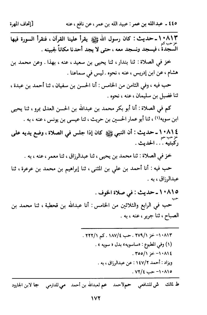 10814 - حَدِيثٌ (خز حب حم) : أَنَّ النَّبِيَّ , صَلَّى اللَّهُ عَلَيْهِ وَسَلَّمَ، كَانَ إِذَا جَلَسَ فِي الصَّلاةِ، وَضَعَ يَدَيْهِ عَلَى رُكْبَتَيْهِ ... الْحَدِيثُ. خز فِي الصَّلاةِ: ثنا مُحَمَّدُ بْنُ يَحْيَى، ثنا عَبْدُ الرَّزَّاقِ، ثنا مَعْمَرٌ، عَنْهُ، بِهِ. حب فِيهِ: أَنَا أَحْمَدُ بْنُ عَلِيِّ بْنِ الْمُثَنَّى، ثنا إِبْرَاهِيمُ بْنُ مُحَمَّدِ بْنِ عَرْعَرَةَ، ثنا عَبْدُ الرَّزَّاقِ، بِهِ.