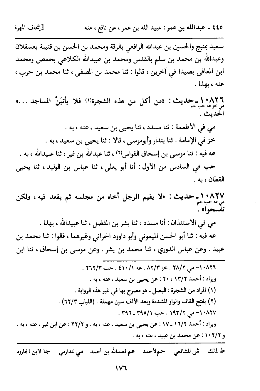10826 - حَدِيثٌ (مي خز عه حب حم) : " مَنْ أَكَلَ مِنْ هَذِهِ الشَّجَرَةِ فَلا يَأْتِيَنَّ الْمَسَاجِدَ ... " الْحَدِيثُ. مي فِي الأَطْعِمَةِ: ثنا مُسَدِّدٌ، ثنا يَحْيَى بْنُ سَعِيدٍ، عَنْهُ، بِهِ. خز فِي الإِمَامَةِ: ثنا بُنْدَارٌ، وَأَبُو مُوسَى، قَالا: ثنا يَحْيَى بْنُ سَعِيدٍ، بِهِ. عه فِيهِ: ثنا مُوسَى بْنُ إِسْحَاقَ الْقَوَّاسُ، ثنا عَبْدُ اللَّهِ بْنُ نُمَيْرٍ، ثنا عُبَيْدُ اللَّهِ، بِهِ. حب فِي السَّادِسِ مِنَ الأَوَّلِ: أَنَا أَبُو يَعْلَى، ثنا عَبَّاسُ بْنُ الْوَلِيدِ، ثنا يَحْيَى الْقَطَّانُ، بِهِ.