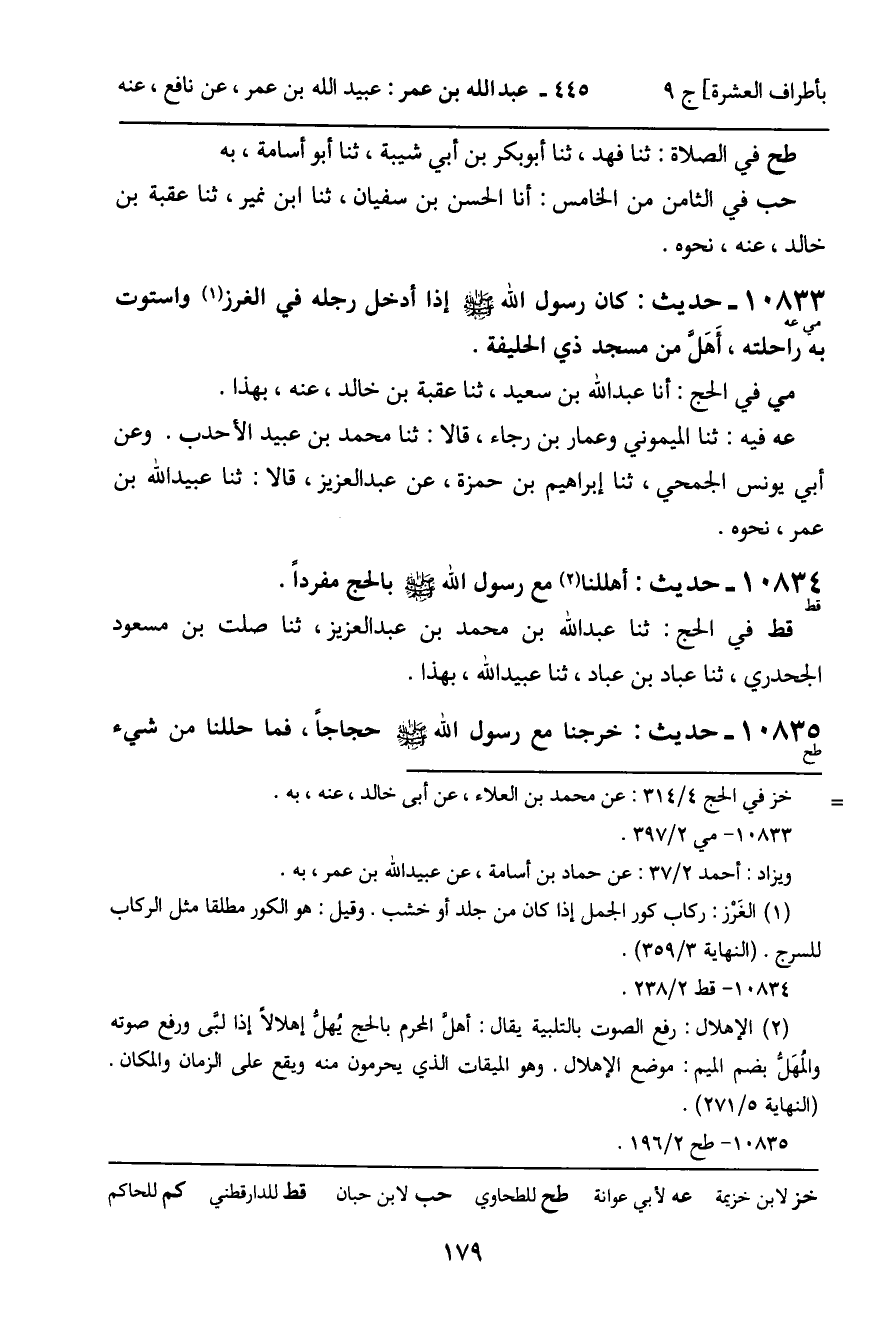 10833 - حَدِيثٌ (مي عه) : كَانَ رَسُولُ اللَّهِ , صَلَّى اللَّهُ عَلَيْهِ وَسَلَّمَ، إِذَا أَدْخَلَ رِجْلَهُ فِي الْغَرْزِ وَاسْتَوَتْ بِهِ رَاحِلَتُهُ، أَهَلَّ مِنْ مَسْجِدِ ذِي الْحُلَيْفَةِ. مي فِي الْحَجِّ: أَنَا عَبْدُ اللَّهِ بْنُ سَعِيدٍ، ثنا عُقْبَةُ بْنُ خَالِدٍ، عَنْهُ، بِهَذَا. عه فِيهِ: ثنا الْمَيْمُونِيُّ، وَعَمَّارُ بْنُ رَجَاءٍ، قَالا: ثنا مُحَمَّدُ بْنُ عُبَيْدٍ الأَحْدَبُ. وَعَنْ أَبِي يُونُسَ الْجُمَحِيِّ، ثنا إِبْرَاهِيمُ بْنُ حَمْزَةَ، عَنْ عَبْدِ الْعَزِيزِ، قَالا: ثنا عُبَيْدُ اللَّهِ بْنُ عُمَرَ، نَحْوَهُ.