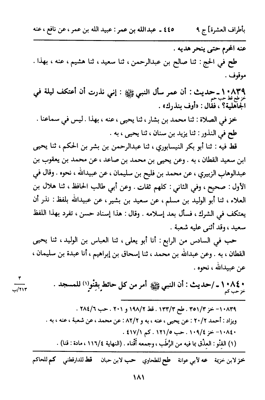 10839 - حَدِيثٌ (خز طح قط حب حم) : أَنَّ عُمَرَ سَأَلَ النَّبِيَّ , صَلَّى اللَّهُ عَلَيْهِ وَسَلَّمَ: إِنِّي نَذَرْتُ أَنْ أَعْتَكِفَ لَيْلَةً فِي الْجَاهِلِيَّةِ؟ فَقَالَ: " أَوْفِ بِنَذْرِكَ ". خز فِي الصَّلاةِ: ثنا مُحَمَّدُ بْنُ بَشَّارٍ، ثنا يَحْيَى، عَنْهُ، بِهَذَا. وَلَيْسَ فِي سَمَاعِنَا. طح فِي النُّذُورِ: ثنا يَزِيدُ بْنُ سِنَانٍ، ثنا يَحْيَى، بِهِ. قط فِيهِ: ثنا أَبُو بَكْرٍ النَّيْسَابُورِيُّ، ثنا عَبْدُ الرَّحْمَنِ بْنُ بِشْرِ بْنِ الْحَكَمِ، ثنا يَحْيَى بْنُ سَعِيدٍ الْقَطَّانُ، بِهِ. وَعَنْ يَحْيَى بْنِ مُحَمَّدِ بْنِ صَاعِدٍ، عَنْ مُحَمَّدِ بْنِ يَعْقُوبَ بْنِ عَبْدِ الْوَهَّابِ الزُّبَيْرِيِّ، عَنْ مُحَمَّدِ بْنِ فُلَيْحِ بْنِ سُلَيْمَانَ، عَنْ عُبَيْدِ اللَّهِ، نَحْوَهُ. وَقَالَ فِي الأَوَّلِ: صَحِيحٌ، وَفِي الثَّانِي: كُلُّهُمْ ثِقَاتٌ. وَعَنْ أَبِي طَالِبٍ الْحَافِظِ، ثنا هِلالُ بْنُ الْعَلاءِ، ثنا أَبُو الْوَلِيدِ بْنُ مُسْلِمٍ، عَنْ سَعِيدِ بْنِ بَشِيرٍ، عَنْ عُبَيْدِ اللَّهِ بِلَفْظِ: نَذَرَ أَنْ يَعْتَكِفَ فِي الشِّرْكِ، فَسَأَلَ بَعْدَ إِسْلامِهِ. وَقَالَ: هَذَا إِسْنَادٌ حَسَنٌ، تَفَرَّدَ بِهَذَا اللَّفْظِ سَعِيدٌ، وَقَدْ أَثْنَى عَلَيْهِ شُعْبَةُ. حب فِي السَّادِسِ مِنَ الرَّابِعِ: أَنَا أَبُو يَعْلَى، ثنا الْعَبَّاسُ بْنُ الْوَلِيدِ، ثنا يَحْيَى الْقَطَّانُ، بِهِ. وَعَنْ عَبْدِ اللَّهِ بْنِ مُحَمَّدٍ، ثنا إِسْحَاقُ بْنُ إِبْرَاهِيمَ، أَنَا عَبْدَةُ بْنُ سُلَيْمَانَ، عَنْ عُبَيْدِ اللَّهِ، نَحْوَهُ.