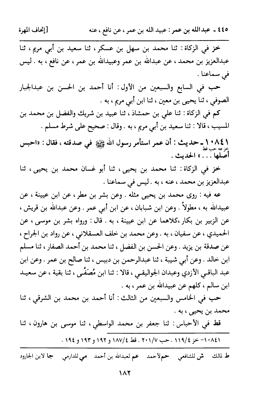 10841 - حَدِيثٌ (خز عه حب قط) : أَنَّ عُمَرَ اسْتَأْمَرَ رَسُولَ اللَّهِ , صَلَّى اللَّهُ عَلَيْهِ وَسَلَّمَ، فِي صَدَقَتِهِ، فَقَالَ: " احْبِسْ أَصْلَهَا ... " الْحَدِيثُ. خز فِي الزَّكَاةِ: ثنا مُحَمَّدُ بْنُ يَحْيَى، ثنا أَبُو غَسَّانَ مُحَمَّدُ بْنُ يَحْيَى، ثنا عَبْدُ الْعَزِيزِ بْنُ مُحَمَّدٍ، عَنْهُ، بِهِ. لَيْسَ فِي سَمَاعِنَا. عه فِيهِ: رَوَى مُحَمَّدُ بْنُ يَحْيَى مِثْلَهُ. وَعَنْ بِشْرِ بْنِ مَطَرٍ، عَنِ ابْنِ عُيَيْنَةَ، عَنْ عُبَيْدِ اللَّهِ بِهِ، مُطَوَّلا. وَعَنِ ابْنِ شَبَابَانَ، عَنِ ابْنِ أَبِي عُمَرَ. وَعَنْ عَبْدِ اللَّهِ بْنِ قُرَيْشٍ، عَنِ الزُّبَيْرِ بْنِ بَكَّارٍ، كِلاهُمَا عَنِ ابْنِ عُيَيْنَةَ، بِهِ. وَقَالَ: وَرَوَاهُ بِشْرُ بْنُ مُوسَى، عَنِ الْحُمَيْدِيِّ، عَنْ سُفْيَانَ، بِهِ. وَعَنْ مُحَمَّدِ بْنِ خَلَفٍ الْعَسْقَلانِيِّ، عَنْ رَوَّادِ بْنِ الْجَرَّاحِ، عَنْ صَدَقَةَ بْنِ يَزِيدَ. وَعَنِ الْحَسَنِ بْنِ الْفَضْلِ، ثنا مُحَمَّدُ بْنُ أَحْمَدَ بْنِ الصَّفَّارِ، ثنا مُسْلِمُ بْنُ خَالِدٍ. وَعَنْ أَبِي شَيْبَةَ، ثنا عَبْدُ الرَّحْمَنِ بْنُ دُبَيْسٍ، ثنا صَالِحُ بْنُ عُمَرَ. وَعَنِ ابْنِ عَبْدِ الْبَاقِي الأَزْدِيِّ، وَعَبْدَانَ الْجَوَالِيقِيِّ، قَالا: ثنا ابْنُ مُصَفَّى، ثنا بَقِيَّةُ، عَنْ سَعِيدِ بْنِ سَالِمٍ، كُلُّهُمْ عَنْ عُبَيْدِ اللَّهِ بْنِ عُمَرَ، بِهِ. حب فِي الْخَامِسِ وَالسَّبْعِينَ مِنَ الثَّالِثِ: أَنَا أَحْمَدُ بْنُ مُحَمَّدٍ الشَّرْقِيُّ، ثنا مُحَمَّدُ بْنُ يَحْيَى، بِهِ. قط فِي الأَحْبَاسِ: ثنا جَعْفَرُ بْنُ مُحَمَّدٍ الْوَاسِطِيُّ، ثنا مُوسَى بْنُ هَارُونَ، ثنا