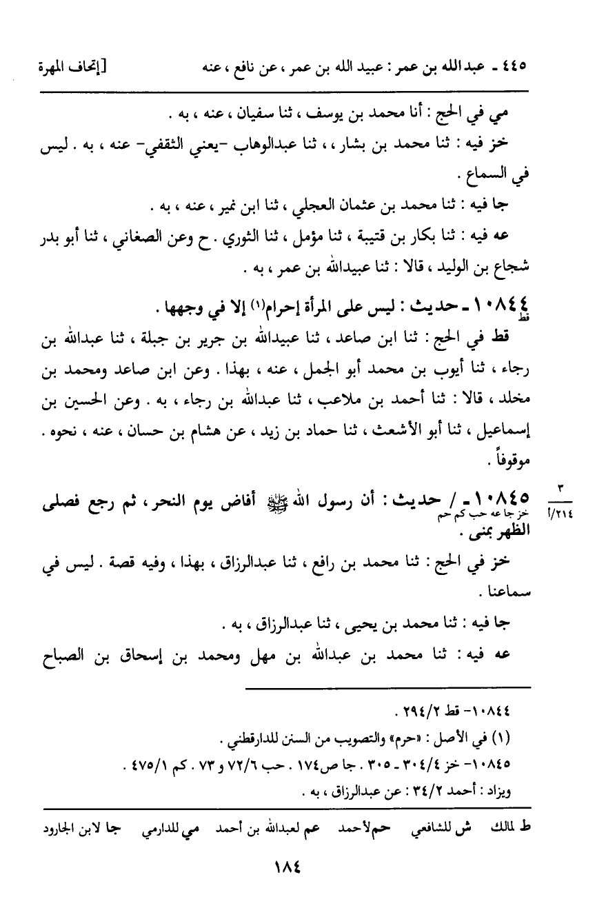 10845 - حَدِيثٌ (خز جا عه حب كم حم) : أَنَّ رَسُولَ اللَّهِ , صَلَّى اللَّهُ عَلَيْهِ وَسَلَّمَ، أَفَاضَ يَوْمَ النَّحْرِ، ثُمَّ رَجَعَ فَصَلَّى الظُّهْرَ بِمِنًى. خز فِي الْحَجِّ: ثنا مُحَمَّدُ بْنُ رَافِعٍ، ثنا عَبْدُ الرَّزَّاقِ، بِهَذَا، وَفِيهِ قِصَّةٌ. لَيْسَ فِي سَمَاعِنَا. جا فِيهِ: ثنا مُحَمَّدُ بْنُ يَحْيَى، ثنا عَبْدُ الرَّزَّاقِ، بِهِ. عه فِيهِ: ثنا مُحَمَّدُ بْنُ عَبْدِ اللَّهِ بْنِ مُهَلٍّ، وَمُحَمَّدِ بْنِ إِسْحَاقَ بْنِ الصَّبَّاحِ