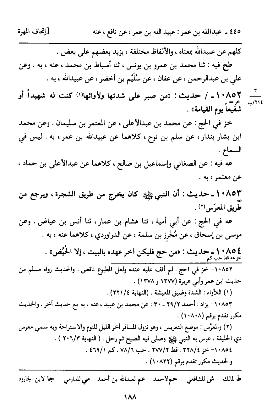 10852 - حَدِيثٌ (خز عه) : " مَنْ صَبَرَ عَلَى شِدَّتِهَا وَلأْوَائِهَا كُنْتُ لَهُ شَهِيدًا أَوْ شَفِيعًا يَوْمَ الْقِيَامَةِ ". خز فِي الْحَجِّ: عَنْ مُحَمَّدِ بْنِ عَبْدِ الأَعْلَى، عَنِ الْمُعْتَمِرِ بْنِ سُلَيْمَانَ. وَعَنْ مُحَمَّدِ بْنِ بَشَّارٍ بُنْدَارٍ، عَنْ سَلْمِ بْنُ نُوحٍ، كِلاهُمَا عَنْ عُبَيْدِ اللَّهِ بْنِ عُمَرَ، بِهِ. لَيْسَ فِي السَّمَاعِ. عه فِيهِ: عَنِ الصَّغَانِيِّ، وَإِسْمَاعِيلَ بْنِ صَالِحٍ، كِلاهُمَا عَنْ عَبْدِ الأَعْلَى بْنِ حَمَّادٍ، عَنْ مُعْتَمِرٍ، بِهِ.