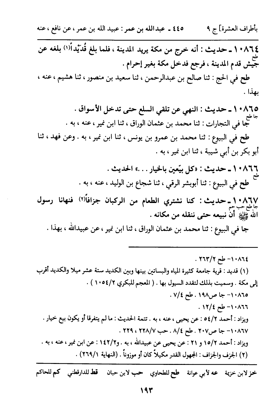 10865 - حَدِيثٌ (جا طح) : النَّهْيُ عَنْ تَلَقِّي السِّلَعِ حَتَّى تَدْخُلَ الأَسْوَاقَ. جا فِي التِّجَارَاتِ: ثنا مُحَمَّدُ بْنُ عُثْمَانَ الْوَرَّاقُ، ثنا ابْنُ نُمَيْرٍ، عَنْهُ، بِهِ. طح فِي الْبُيُوعِ: ثنا مُحَمَّدُ بْنُ عَمْرِو بْنِ يُونُسَ، ثنا ابْنُ نُمَيْرٍ، بِهِ. وَعَنْ فَهْدٍ، ثنا أَبُو بَكْرِ بْنُ أَبِي شَيْبَةَ، ثنا ابْنُ نُمَيْرٍ، بِهِ.
