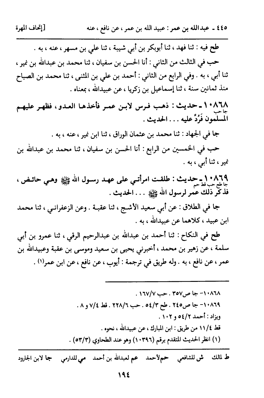 10869 - حَدِيثٌ (جا طح حب قط حم) : طَلَّقْتُ امْرَأَتِي عَلَى عَهْدِ رَسُولِ اللَّهِ، صَلَّى اللَّهُ عَلَيْهِ وَسَلَّمَ، وَهِيَ حَائِضٌ، فَذَكَرَ ذَلِكَ عُمَرُ لِرَسُولِ اللَّهِ، صَلَّى اللَّهُ عَلَيْهِ وَسَلَّمَ ... الْحَدِيثَ. جا فِي الطَّلاقِ: عَنْ أَبِي سَعِيدٍ الأَشَجِّ، ثنا عُقْبَةُ. وَعَنِ الزَّعْفَرَانِيِّ، ثنا مُحَمَّدُ بْنُ عُبَيْدٍ، كِلاهُمَا عَنْ عُبَيْدِ اللَّهِ، بِهِ. طح فِي النِّكَاحِ: ثنا أَحْمَدُ بْنُ عَبْدِ اللَّهِ بْنِ عَبْدِ الرَّحِيمِ الرَّقِّيُّ، ثنا عَمْرُو بْنُ أَبِي سَلَمَةَ، عَنْ زُهَيْرِ بْنِ مُحَمَّدٍ، أَخْبَرَنِي يَحْيَى بْنُ سَعِيدٍ، وَمُوسَى بْنُ عُقْبَةَ، وَعُبَيْدُ اللَّهِ بْنُ عُمَرَ، عَنْ نَافِعٍ، بِهِ. وَلَهُ طَرِيقٌ فِي تَرْجَمَةِ: أَيُّوبَ، عَنْ نَافِعٍ، عَنِ ابْنِ عُمَرَ.