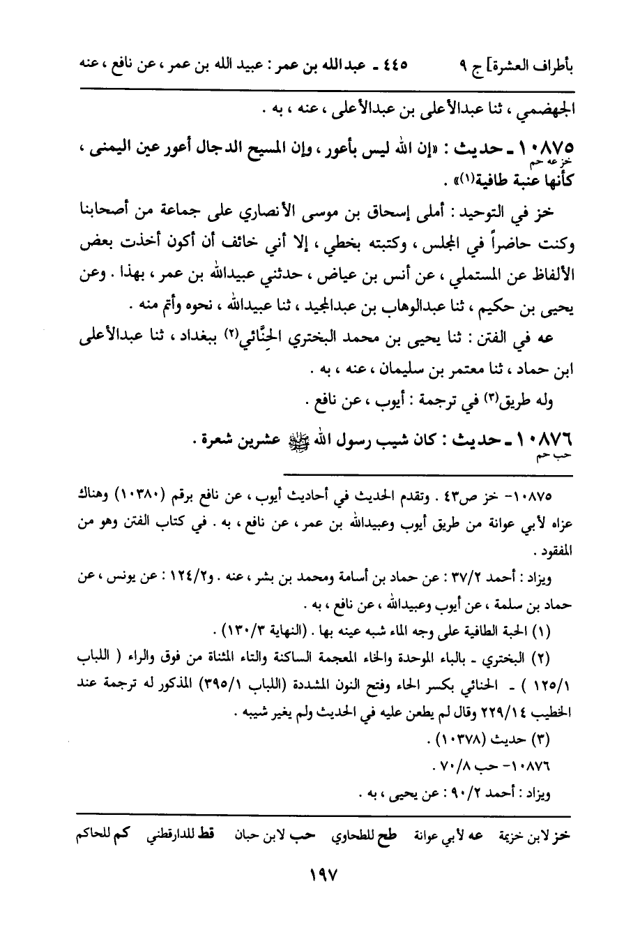 10875 - حَدِيثٌ (خز عه حم) : " إِنَّ اللَّهَ لَيْسَ بِأَعْوَرَ، وَإِنَّ الْمَسِيحَ الدَّجَّالَ أَعْوَرُ عَيْنِ الْيُمْنَى، كَأَنَّهَا عِنَبَةٌ طَافِيَةٌ ". خز فِي التَّوْحِيدِ: أَمْلَى إِسْحَاقُ بْنُ مُوسَى الأَنْصَارِيُّ عَلَى جَمَاعَةٍ مِنْ أَصْحَابِنَا، وَكُنْتُ حَاضِرًا فِي الْمَجْلِسِ، وَكَتَبْتُهُ بِخَطِّي، إِلا أَنِّي خَائِفٌ أَنْ أَكُونَ أَخَذْتُ بَعْضَ الأَلْفَاظِ عَنِ الْمُسْتَمْلِي، عَنْ أَنَسِ بْنِ عِيَاضٍ، حَدَّثَنِي عُبَيْدُ اللَّهِ بْنُ عُمَرَ، بِهَذَا. وَعَنْ يَحْيَى بْنِ حَكِيمٍ، ثنا عَبْدُ الْوَهَّابِ بْنُ عَبْدِ الْمَجِيدِ، ثنا عُبَيْدُ اللَّهِ، نَحْوَهُ وَأَتَمَّ مِنْهُ. عه فِي الْفِتَنِ: ثنا يَحْيَى بْنُ مُحَمَّدٍ الْبَخْتَرِيُّ الْحِنَّائِيُّ بِبَغْدَادَ، ثنا عَبْدُ الأَعْلَى بْنُ حَمَّادٍ، ثنا مُعْتَمِرُ بْنُ سُلَيْمَانَ، عَنْهُ، بِهِ. وَلَهُ طَرِيقٌ فِي تَرْجَمَةِ: أَيُّوبَ، عَنْ نَافِعٍ.
