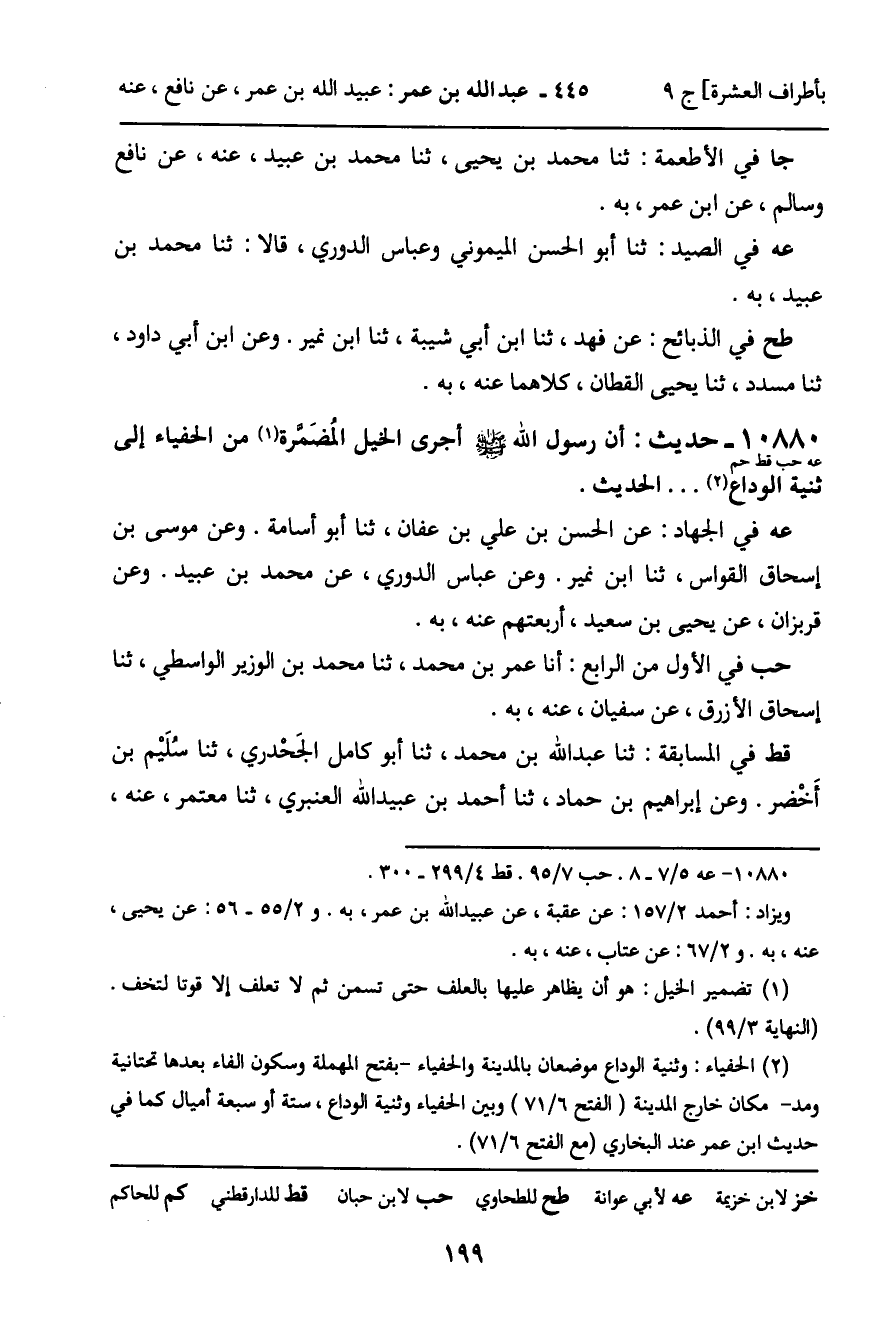 10880 - حَدِيثٌ (عه حب قط حم) : أَنَّ رَسُولَ اللَّهِ، صَلَّى اللَّهُ عَلَيْهِ وَسَلَّمَ، أَجْرَى الْخَيْلَ الْمُضَمَّرَةَ مِنَ الْحَفْيَاءِ إِلَى ثَنِيَّةِ الْوَدَاعِ ... الْحَدِيثُ. عه فِي الْجِهَادِ: عَنِ الْحَسَنِ بْنِ عَلِيِّ بْنِ عَفَّانَ، ثنا أَبُو أُسَامَةَ. وَعَنْ مُوسَى بْنِ إِسْحَاقَ الْقَوَّاسِ، ثنا ابْنُ نُمَيْرٍ. وَعَنْ عَبَّاسٍ الدُّورِيِّ، عَنْ مُحَمَّدِ بْنِ عُبَيْدٍ. وَعَنْ قُرْبُزَانَ، عَنْ يَحْيَى بْنِ سَعِيدٍ، أَرْبَعَتُهُمْ عَنْهُ، بِهِ. حب فِي الأَوَّلِ مِنَ الرَّابِعِ: أَنَا عُمَرُ بْنُ مُحَمَّدٍ، ثنا مُحَمَّدُ بْنُ الْوَزِيرِ الْوَاسِطِيُّ، ثنا إِسْحَاقُ الأَزْرَقُ، عَنْ سُفْيَانَ، عَنْهُ، بِهِ. قط فِي الْمُسَابَقَةِ: ثنا عَبْدُ اللَّهِ بْنُ مُحَمَّدٍ، ثنا أَبُو كَامِلٍ الْجَحْدَرِيُّ، ثنا سُلَيْمُ بْنُ أَخْضَرَ. وَعَنْ إِبْرَاهِيمَ بْنِ حَمَّادٍ، ثنا أَحْمَدُ بْنُ عُبَيْدِ اللَّهِ الْعَنْبَرِيُّ، ثنا مُعْتَمِرٌ، عَنْهُ،