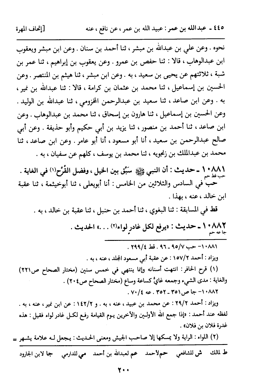 10881 - حَدِيثٌ (حب قط حم) : أَنَّ النَّبِيَّ، صَلَّى اللَّهُ عَلَيْهِ وَسَلَّمَ، سَبَّقَ بَيْنَ الْخَيْلِ، وَفَضَّلَ الْقُرَّحَ فِي الْغَايَةِ. حب فِي السَّادِسِ وَالثَّلاثِينَ مِنَ الْخَامِسِ: أَنَا أَبُو يَعْلَى، ثنا أَبُو خَيْثَمَةَ، ثنا عُقْبَةُ بْنُ خَالِدٍ، عَنْهُ، بِهَذَا. قط فِي الْمُسَابَقَةِ: ثنا الْبَغَوِيُّ، ثنا أَحْمَدُ بْنُ حَنْبَلٍ، ثنا عُقْبَةُ بْنُ خَالِدٍ، بِهِ.