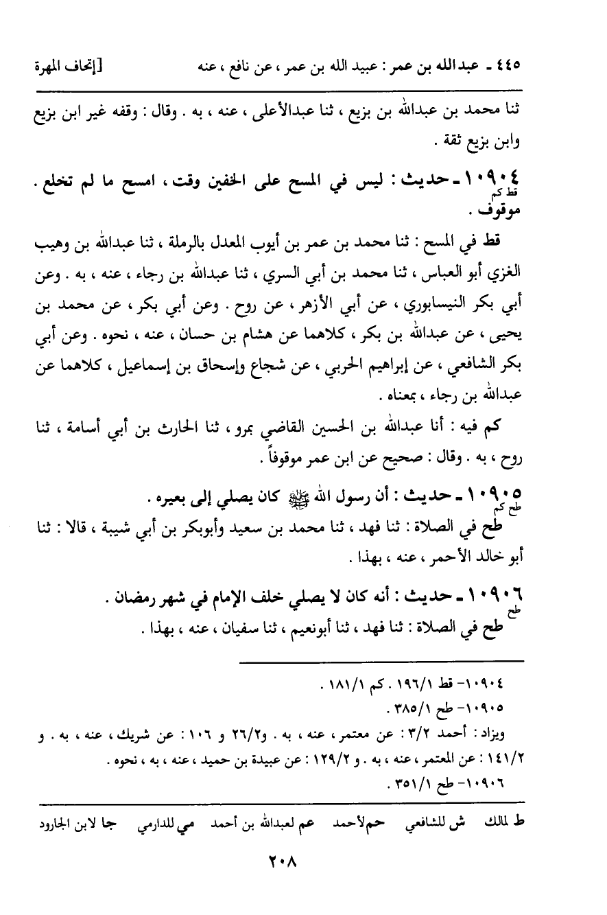 10904 - حَدِيثٌ (قط كم) : لَيْسَ فِي الْمَسْحِ عَلَى الْخُفَّيْنِ وَقْتٌ، امْسَحْ مَا لَمْ تَخْلَعْ. مَوْقُوفٌ. قط فِي الْمَسْحِ: ثنا مُحَمَّدُ بْنُ عُمَرَ بْنِ أَيُّوبَ الْمُعَدَّلُ بِالرَّمْلَةِ، ثنا عَبْدُ اللَّهِ بْنُ وُهَيْبٍ الْغَزِّيُّ أَبُو الْعَبَّاسِ، ثنا مُحَمَّدُ بْنُ أَبِي السَّرِيِّ، ثنا عَبْدُ اللَّهِ بْنُ رَجَاءٍ، عَنْهُ، بِهِ. وَعَنْ أَبِي بَكْرٍ النَّيْسَابُورِيِّ، عَنْ أَبِي الأَزْهَرِ، عَنْ رَوْحٍ. عَنْ أَبِي بَكْرٍ، عَنْ مُحَمَّدِ بْنِ يَحْيَى، عَنْ عَبْدِ اللَّهِ بْنِ بَكْرٍ، كِلاهُمَا عَنْ هِشَامِ بْنِ حَسَّانٍ، عَنْهُ، نَحْوَهُ. وَعَنْ أَبِي بَكْرٍ الشَّافِعِيِّ، عَنْ إِبْرَاهِيمَ الْحَرْبِيِّ، عَنْ شُجَاعٍ، وَإِسْحَاقَ بْنِ إِسْمَاعِيلَ، كِلاهُمَا عَنْ عَبْدِ اللَّهِ بْنِ رَجَاءٍ، بِمَعْنَاهُ. كم فِيهِ: أَنَا عَبْدُ اللَّهِ بْنُ الْحُسَيْنِ الْقَاضِي بِمَرْوَ، ثنا الْحَارِثُ بْنُ أَبِي أُسَامَةَ، ثنا رَوْحٌ، بِهِ. وَقَالَ: صَحِيحٌ، عَنِ ابْنِ عُمَرَ مَوْقُوفًا.