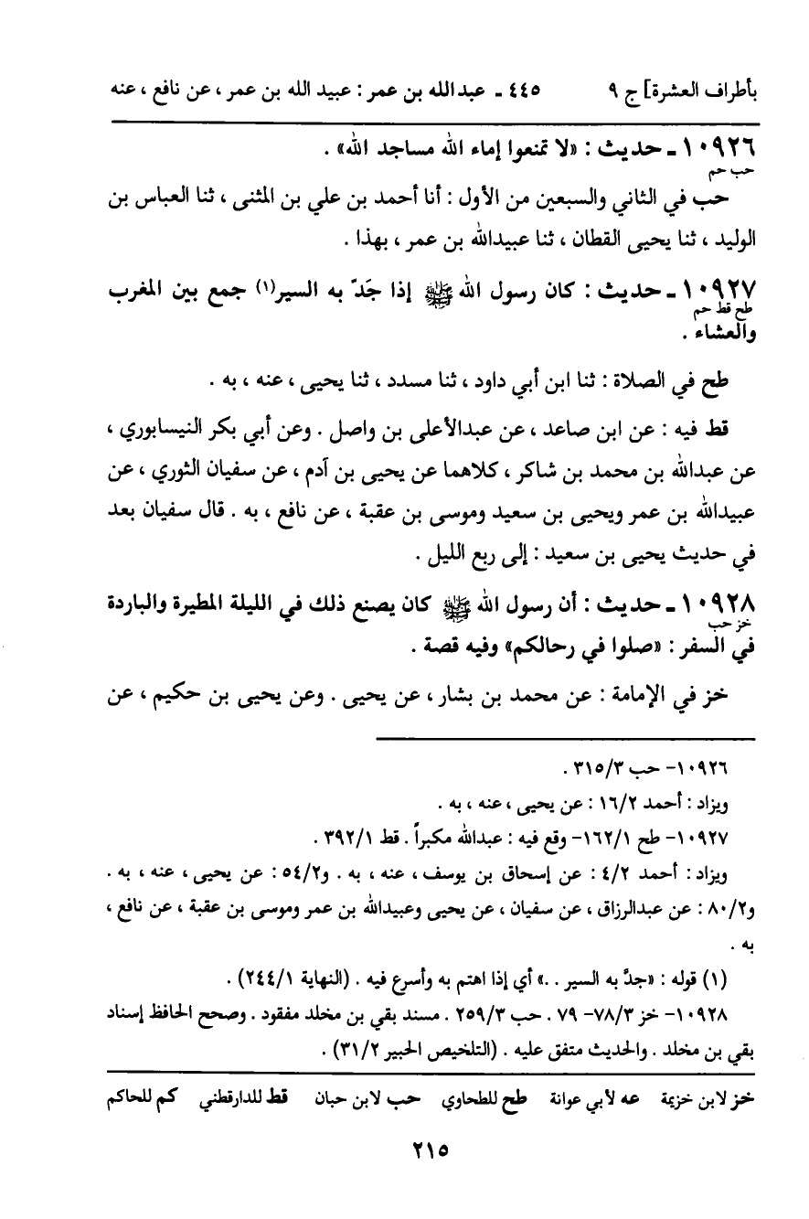 10927 - حَدِيثٌ (طح قط حم) : كَانَ رَسُولُ اللَّهِ، صَلَّى اللَّهُ عَلَيْهِ وَسَلَّمَ، إِذَا جَدَّ بِهِ السَّيْرُ جَمَعَ بَيْنَ الْمَغْرِبِ وَالْعِشَاءِ. طح فِي الصَّلاةِ: ثنا ابْنُ أَبِي دَاوُدَ، ثنا مُسَدَّدٌ، ثنا يَحْيَى، عَنْهُ، بِهِ. قط فِيهِ: عَنِ ابْنِ صَاعِدٍ، عَنْ عَبْدِ الأَعْلَى بْنِ وَاصِلٍ. وَعَنْ أَبِي بَكْرٍ النَّيْسَابُورِيِّ، عَنْ عَبْدِ اللَّهِ بْنِ مُحَمَّدِ بْنِ شَاكِرٍ، كِلاهُمَا عَنْ يَحْيَى بْنِ آدَمَ، عَنْ سُفْيَانَ الثَّوْرِيِّ، عَنْ عُبَيْدِ اللَّهِ بْنِ عُمَرَ، وَيَحْيَى بْنِ سَعِيدٍ، وَمُوسَى بْنِ عُقْبَةَ، عَنْ نَافِعٍ، بِهِ. قَالَ سُفْيَانُ بَعْدُ فِي حَدِيثِ يَحْيَى بْنِ سَعِيدٍ: إِلَى رُبُعِ اللَّيْلِ.
