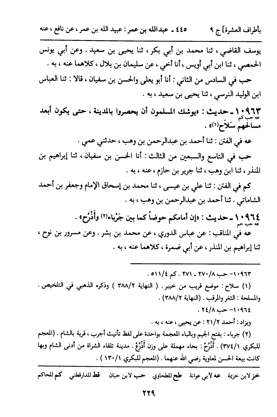 10963 - حَدِيثٌ (عه حب كم) : " يُوشِكُ الْمُسْلِمُونَ أَنْ يُحْصَرُوا بِالْمَدِينَةِ، حَتَّى يَكُونَ أَبْعَدَ مَسَالِحِهِمْ سَلاحُ ". عه فِي الْفِتَنِ: ثنا أَحْمَدُ بْنُ عَبْدِ الرَّحْمَنِ بْنِ وَهْبٍ، حَدَّثَنِي عَمِّي. حب فِي التَّاسِعِ وَالسَّبْعِينَ مِنَ الثَّالِثِ: أَنَا الْحَسَنُ بْنُ سُفْيَانَ، ثنا إِبْرَاهِيمُ بْنُ الْمُنْذِرِ، ثنا ابْنُ وَهْبٍ، ثنا جَرِيرُ بْنُ حَازِمٍ، عَنْهُ، بِهِ. كم فِي الْفِتَنِ: ثنا عَلِيُّ بْنُ عِيسَى، ثنا مُحَمَّدُ بْنُ إِسْحَاقَ الإِمَامُ، وَجَعْفَرُ بْنُ أَحْمَدَ الشَّامَاتِيُّ: ثنا أَحْمَدُ بْنُ عَبْدِ الرَّحْمَنِ بْنِ وَهْبٍ، بِهِ.
